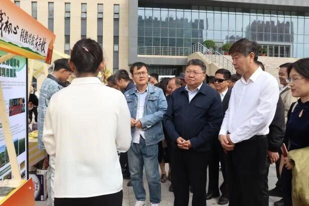 参会人员还参观了承办学院的科研成果展和创新大赛获奖成果展,观摩了学生创作的种子艺术画、手工制品、文创作品等,并了解了校企合作企业展出的五谷杂粮等特色农产品。