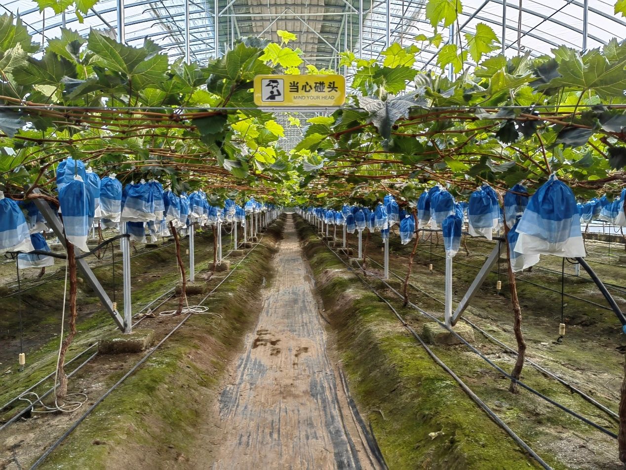 在朱总的引导下,同学们参观了蓝莓和阳光玫瑰葡萄的智能生产棚室。与传统农业不同,这里的种植模式实现了高度智能化——通过无线传感器实时监测每棵植株的生长状态,精准调控不同阶段所需的营养成分,水肥精准配比,做到植物需要什么就给什么;同时,采用零排放环控技术,自动调节大棚内的温度与空气质量,大幅减少人工干预,真正实现了高效、精准、可持续的农业生产。