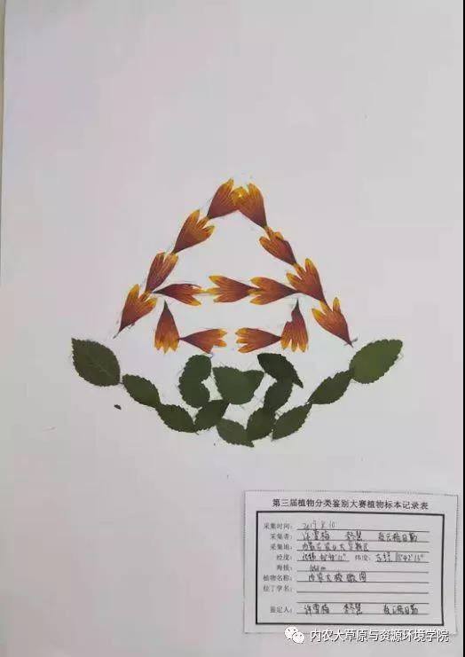 4. 4号 作品介绍:总体图案代表内蒙古农牧学院和内蒙古林学院两校合并,上部代表蒙古包,下部为吉祥符。由天人菊的花的标本粘贴而成。 参赛团队:Alfafla队