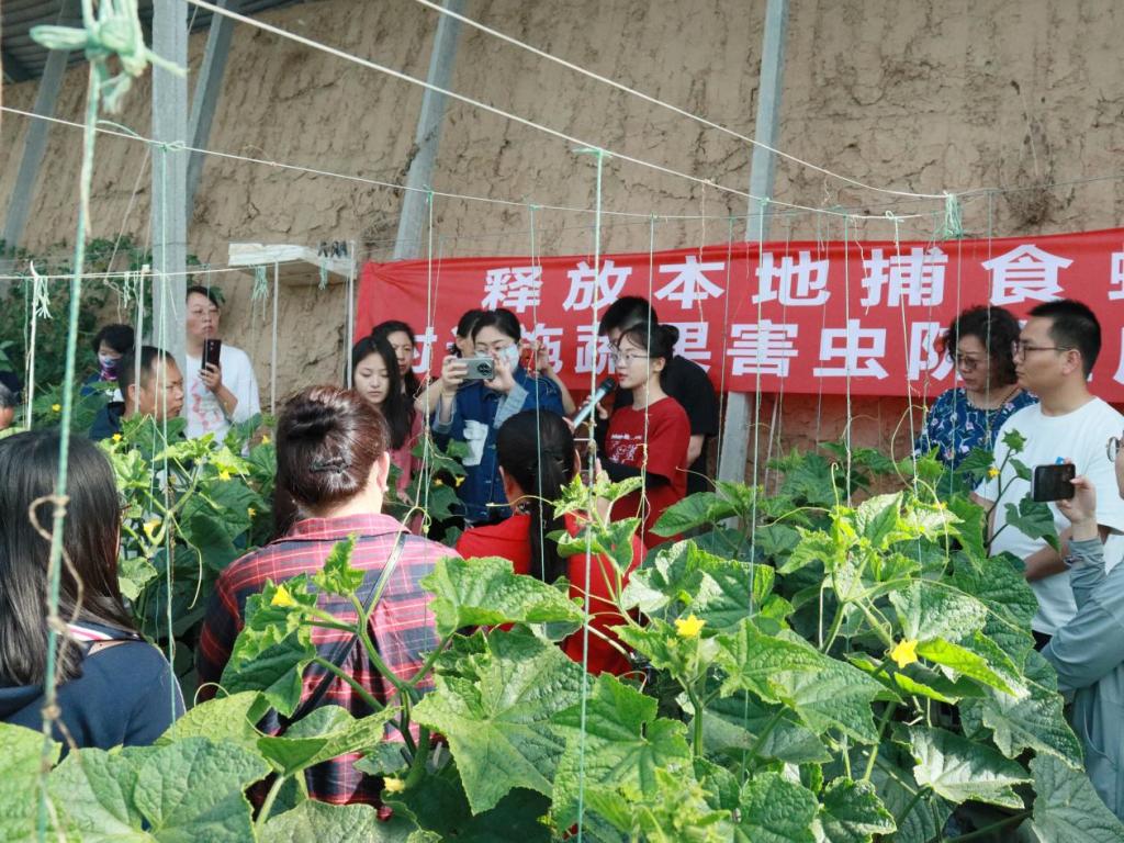 孟瑞霞教授及博士生付晓彤详细讲解并示范了释放天敌捕食螨的具体操作规程及注意事项,共同观摩了捕食螨生物防治的效果。随后又在室内举行了培训讲座,从捕食螨天敌资源采集鉴定、捕食潜力研究、释放应用技术、统计调查方法及防治效果评价等方面进行了讲授,并与当地农技人员交流探讨,使农技人员进一步认识到释放天敌捕食螨对小型害虫绿色防控的作用及重要性,为推动利用本地捕食螨生物防控设施蔬果有害生物、促进农产品质量安全及农业生态环境安全提供了科技支撑。
