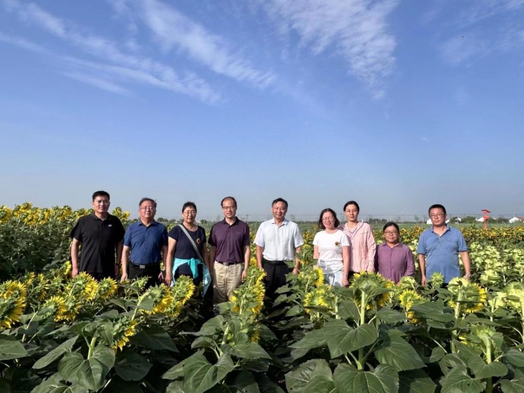 2022年由我校赵君教授牵头,联合青岛农业大学与国家特色油料产业技术体系相关岗位科学家在黄河三角洲盐碱地进行了小面积向日葵播种测试,结果验证了油葵在华北盐碱地上的适生性,结合国家“扩种油料”战略,今年将测试播种面积扩种到了45亩。2023年6日下午-7日上午,由国家特色油料作物产业技术体系的岗位科学家和试验站站长等组成的专家组在当地负责人的带领下分别到昌邑市柳疃镇青阜社区和青岛农业大学盐碱地高效农业技术产业研究院基地(东营)现场观摩了青阜农业综合体和黄河三角洲农高区盐碱地向日葵新品种及配套种植技术。我校赵君教授作为此次观摩会的主要负责人之一,分别向专家组介绍了不同向日葵品种的种植情况,病虫害发生情况以及未来向日葵种植规划情况。专家组对盐碱地农高区依托国家特色油料作物产业体系开展的盐碱地向日葵新品种种植工作给予了充分肯定,并提出下一步要加强向日葵品种的筛选种植与推广,旨在将向日葵作为黄河入海口盐碱地改良的先锋作物,在盐碱地高效利用方面发挥巨大的作用。