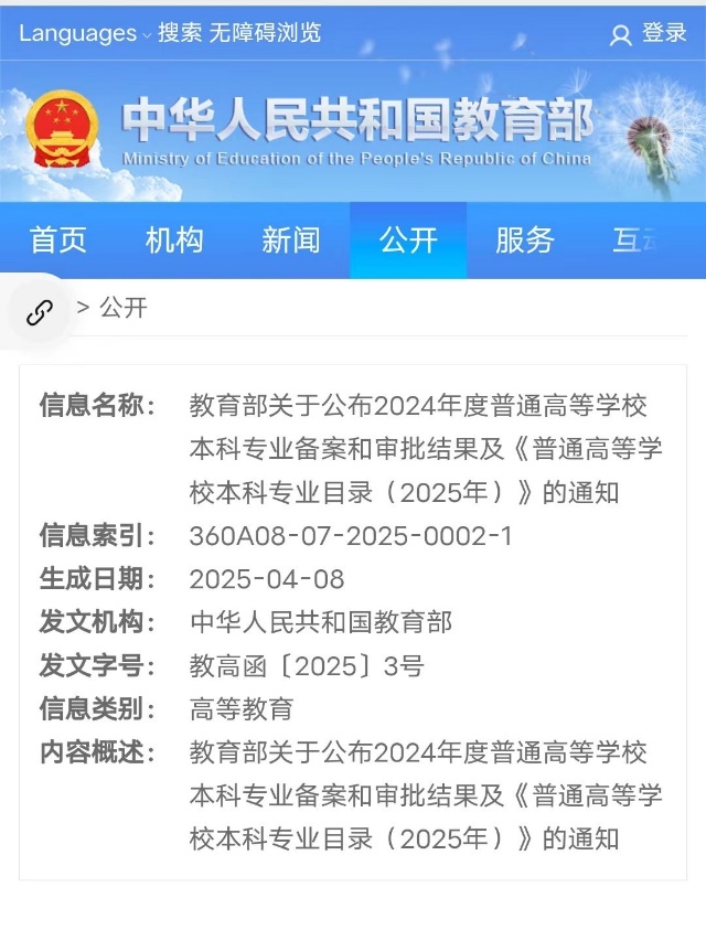 近日,教育部正式公布了2024年普通高等学校本科专业备案和审批结果及《普通高等学校本科专业目录(2025年)》,电影天堂