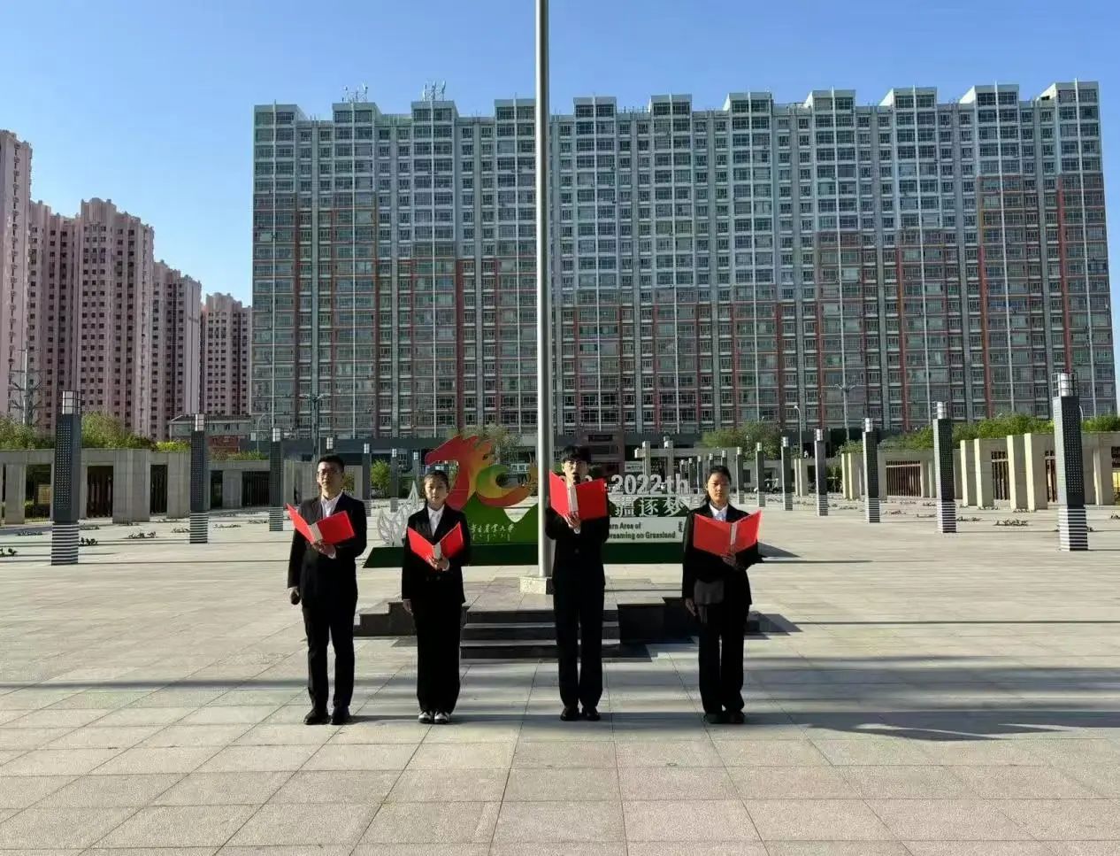 在国旗下,23级设农一班滕浩然、23级园艺三班陈彦儒、24级植保二班张佳豪、24级植保三班林慧楠带来朗诵《以赤诚之名,赴家国之约》。他们以饱满的热情、铿锵有力的声音,带领师生追溯华夏文明的悠远历程。他们以“赤诚”为纽带,以青春之声弘扬家国情怀,从甲午海战的怒潮到抗战烽火的洗礼,从改革开放的春风到科技自立的腾飞,爱国主义始终是中华儿女心中最坚定的信仰。他们以诗意的语言表达了对祖国的深情告白。