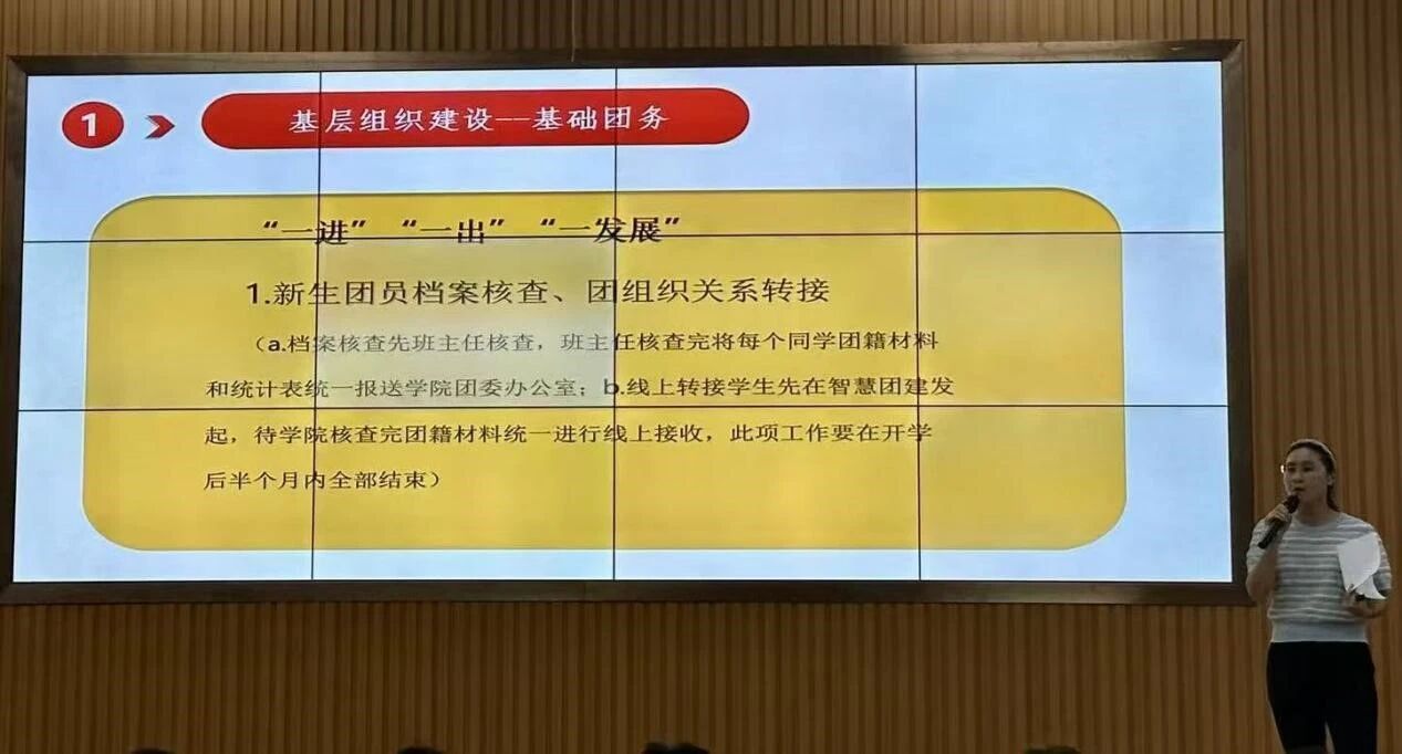 团委老师郝凤英结合多年工作经验,系统介绍了学院共青团基本情况,重点围绕"基层组织建设、思想政治引领、学生成长服务、特色亮点活动"四个核心维度展开讲解。她以生动的实践案例,深入浅出地阐释了共青团工作的育人内涵。最后,郝老师深情寄语新生:要尽早锚定人生航向,在大学时光里保持奋进姿态,以青春热血追逐理想,乘风破浪、勇毅前行,在共青团的引领下绽放绚丽光彩。