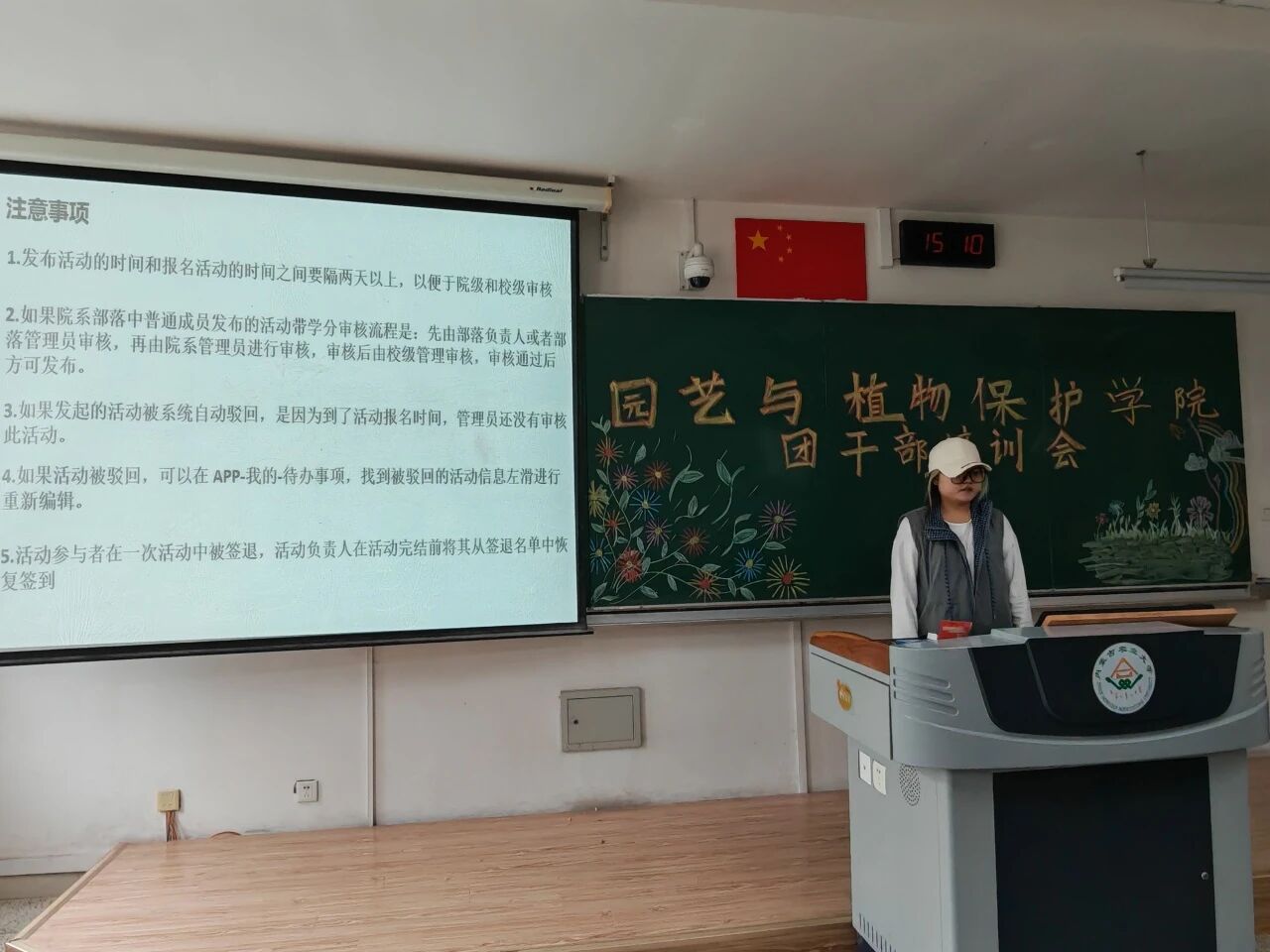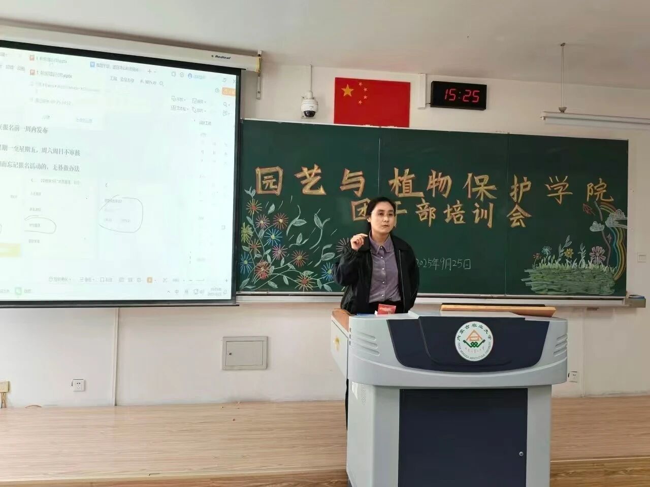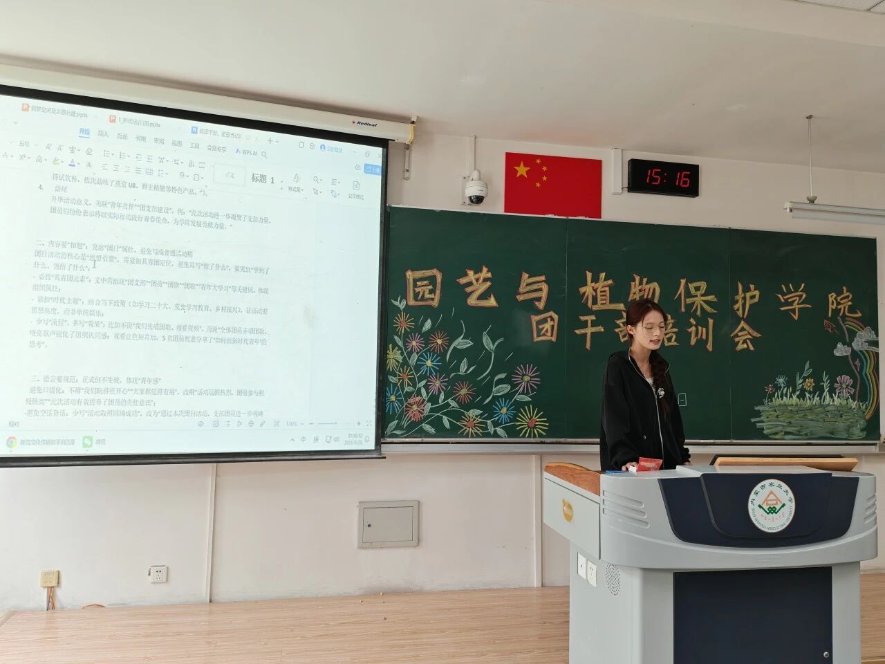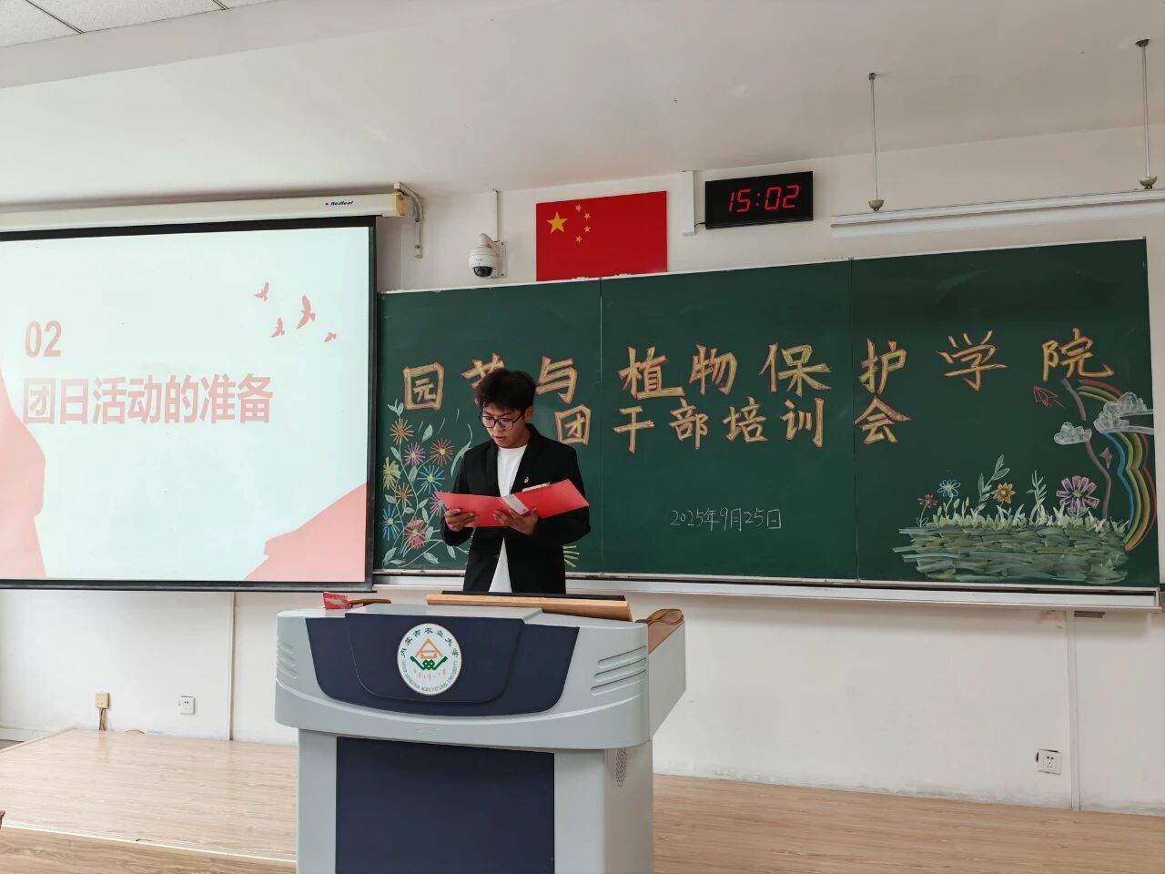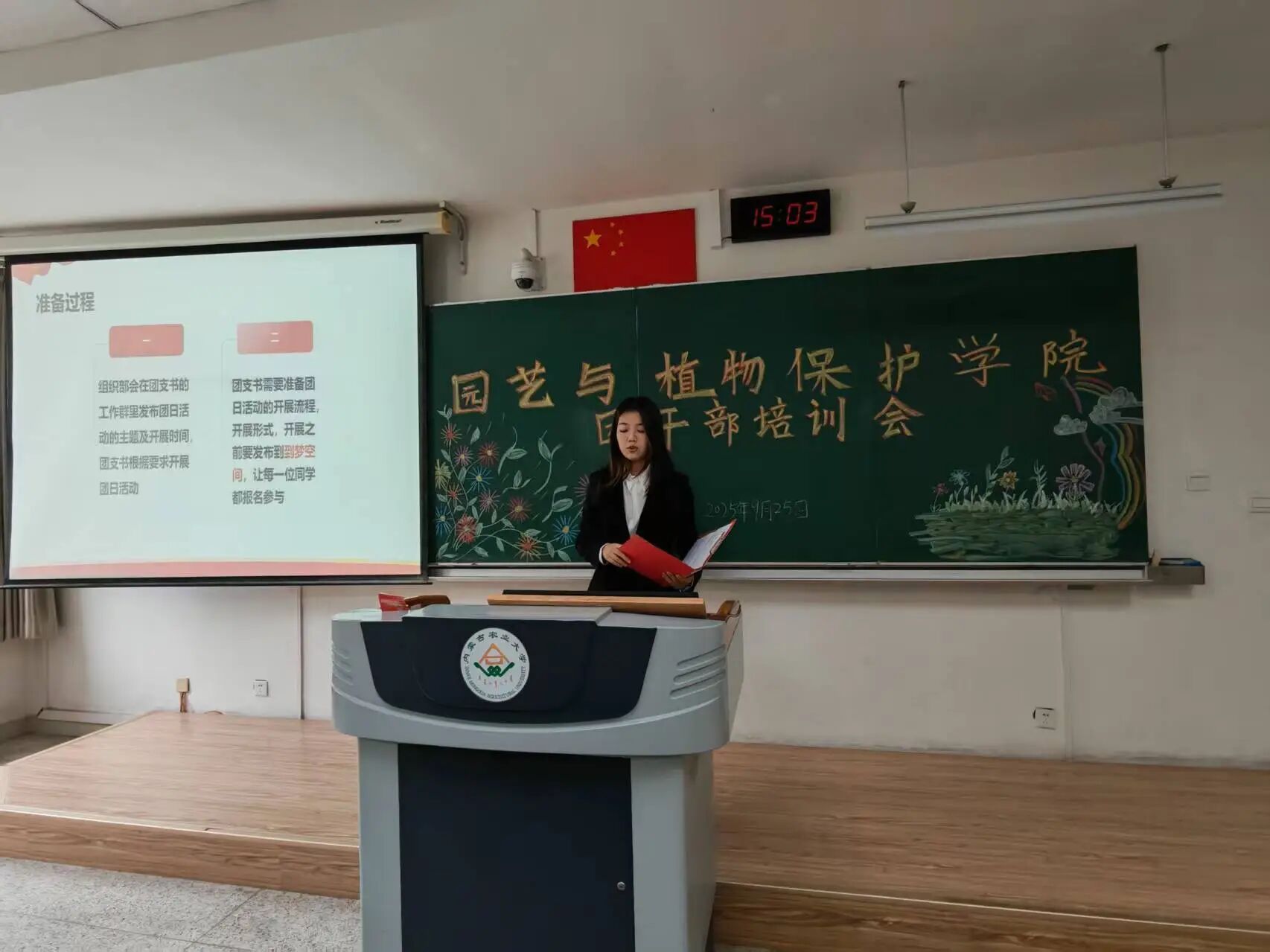 于南教221教室举行了团干部培训会。团委老师郝凤英出席本次会议,2025级全体团干部参加,会议由24级园艺二班张好同主持。