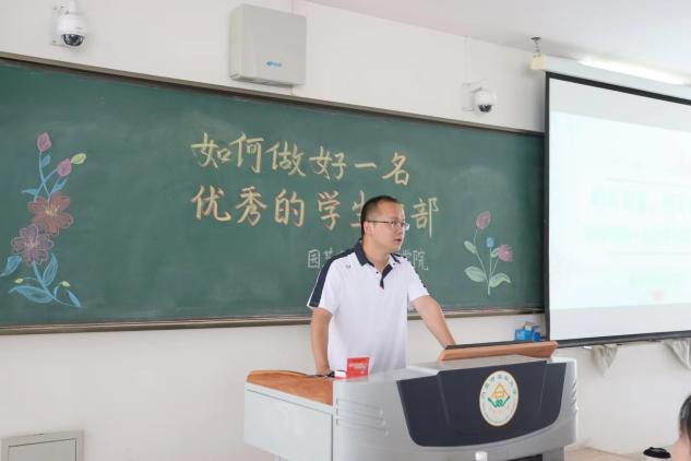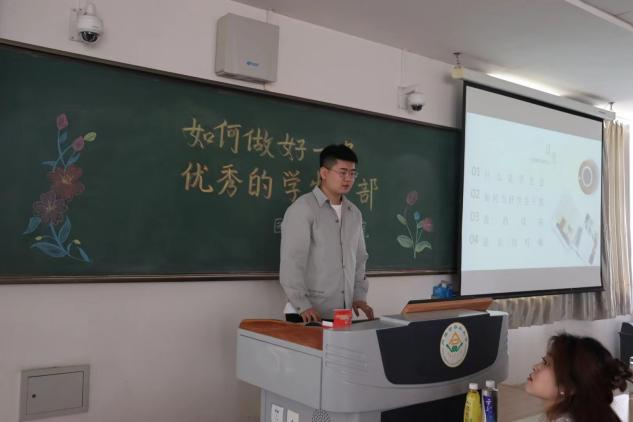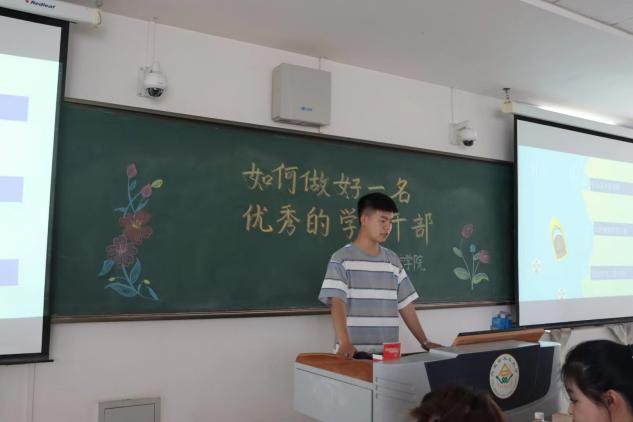 何肖石同学通过什么是学生干部、如何做好学生干部、在工作中的感悟与大家分享。他认为作为一名学生干部要在学习和工作做好表率作用,在工作中,加强技能知识的学习,提升工作效率,同时也要学会学习,平衡好工作与学习之间的关系,只要努力付出就会收获鲜花与掌声。