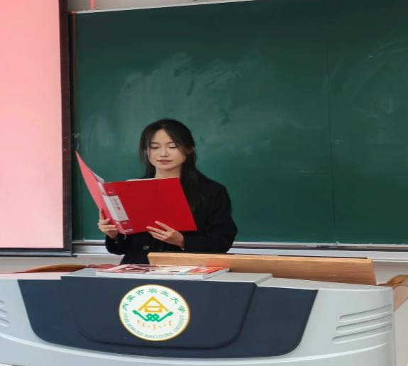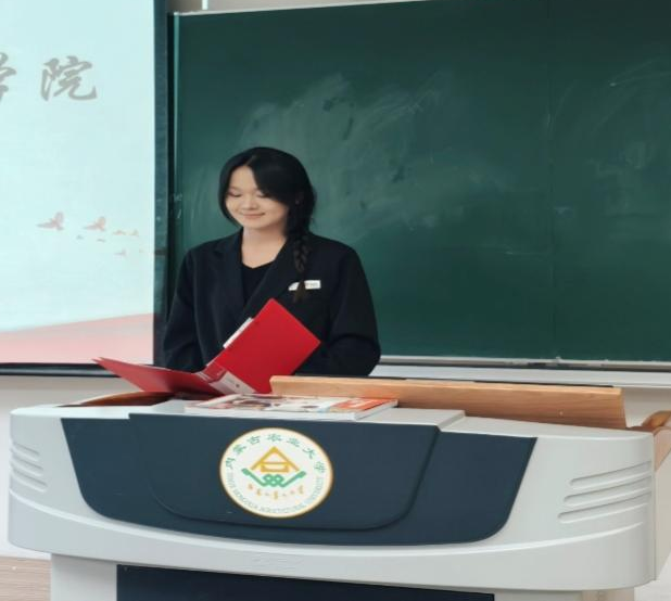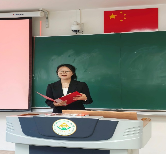 新发展团员代表张蕊发言,她表示作为一名新发展的共青团员,在思想上,生活上,学习上都要有一定的榜样作用。上一期优秀团员代表冯丹为新发展团员送上真挚寄语,她鼓励各位团员积极进取,履行团员义务,严格要求自己、提高思想觉悟,树立崇高理想。