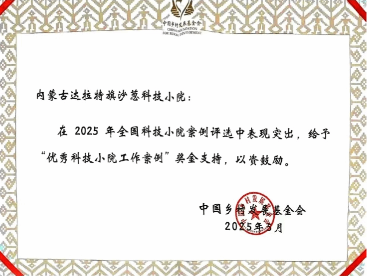 我校牵头建设的内蒙古达拉特旗沙葱小院成功入选“科技小院典型工作案例”,作为全国1800余个科技小院中脱颖而出的50个优秀案例之一接受表彰。成为我校唯一获此殊荣的科技小院。这一荣誉不仅是对沙葱科技小院建设、工作和发展的肯定,更为科技小院赋能乡村振兴战略提供了可借鉴的实践经验。团队通过深入田间地头开展科学研究和产业服务,不断探索农业绿色发展新模式,为荒漠干旱区经济带农业实现绿色、可持续发展提供了有力支撑。未来,沙葱小院将继续秉持“科技助农、教育兴农”的理念,充分发挥科技小院的示范引领作用,扎根乡村,服务基层,为实现农业农村现代化和全面推进乡村振兴贡献更多智慧与力量。