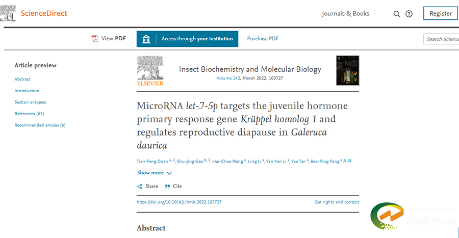 博士研究生段天凤为论文的第一作者,庞保平教授为论文的通讯作者。上述研究成果由国家自然科学基金项目“沙葱萤叶甲成虫夏滞育分子机理的研究”(31760517)资助完成。