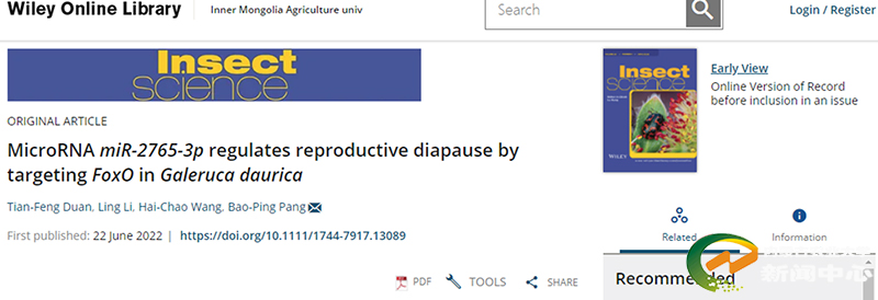 近日,电影天堂 庞保平教授担任通讯作者,博士研究生段天凤为第一作者,在国际知名昆虫学期刊《Insect Science》(中科院一区TOP)在线发表题为“MicroRNAmiR-2765-3pregulates reproductive diapause by targetingFoxOinGaleruca daurica(微小RNAmiR-2765-3p通过靶标FoxO调控沙葱萤叶甲的生殖滞育)”的最新研究成果。