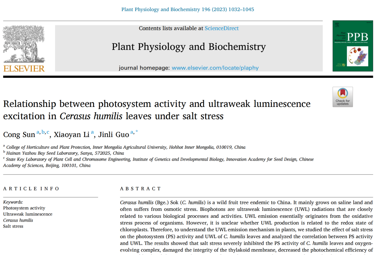 郭金丽教授研究团队以我国特有野生果树资源——欧李作为研究对象,对盐胁迫下欧李叶片光系统活性与超微弱发光强度的变化趋势及二者之间的关系进行检测分析,研究取得了新进展,成果发表在《Plant Physiology and Biochemistry》上(IF=5.437)。