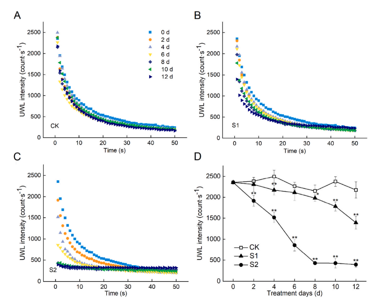 图盐胁迫下欧李叶片UWL的变化趋势