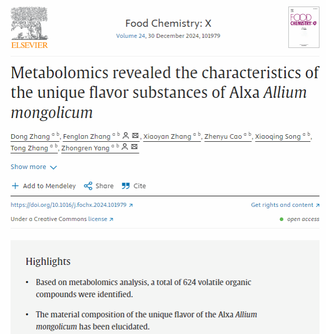 为第一单位,在中国科学院分区的一区期刊《Food Chemistry: X》发表了题为“Metabolomics revealed the characteristics of the unique flavor substances of Alxa Allium mongolicum”的研究成果。论文第一作者为青年教师张东,杨忠仁教授和张凤兰教授为通讯作者。
