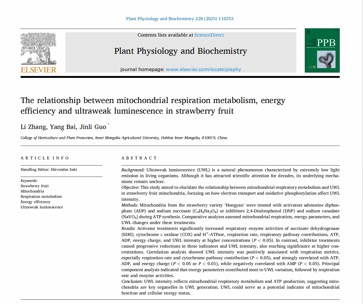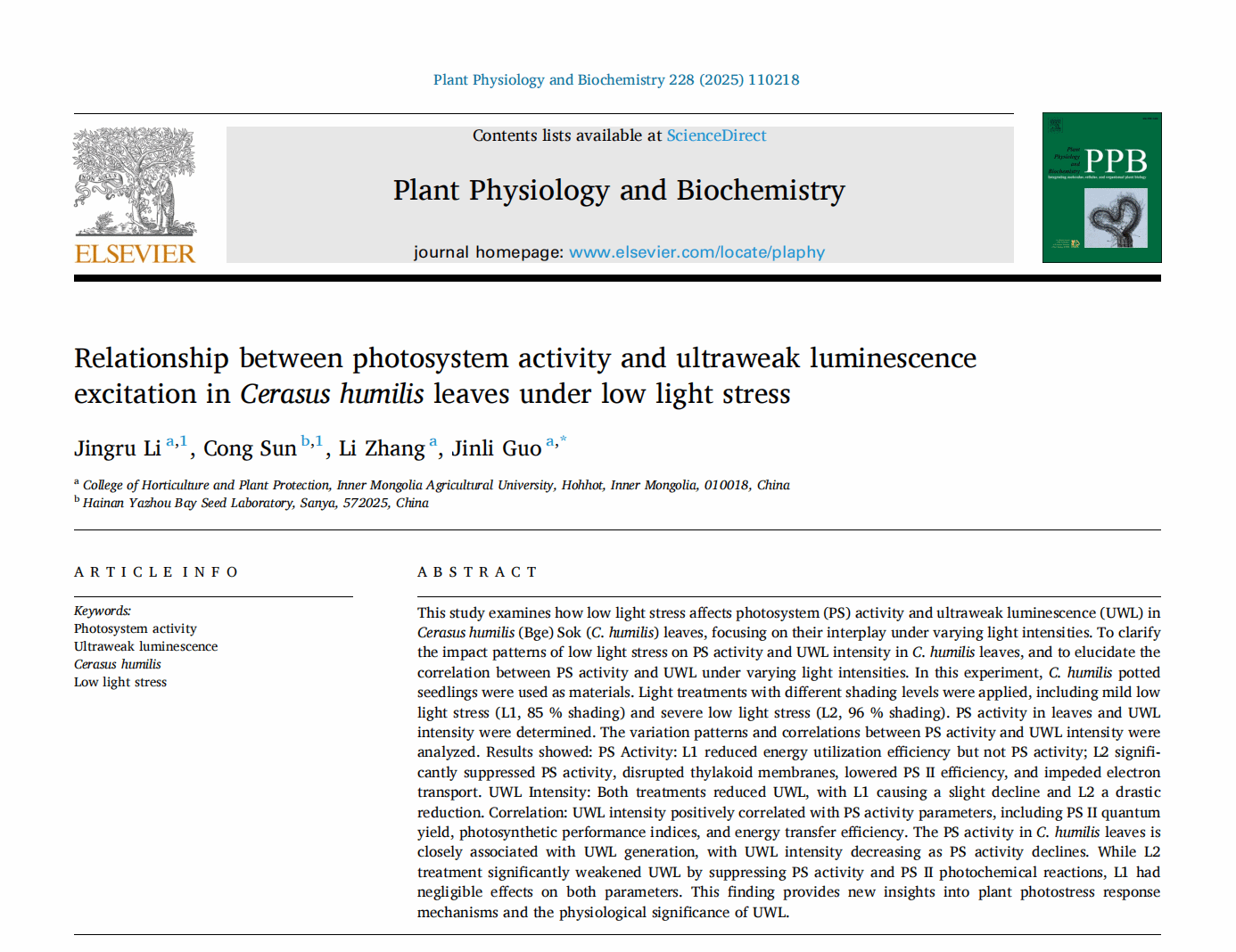 为第一单位,在《Plant Physiology and Biochemistry》(中科院二区TOP期刊)上发表2项题为Relationship between photosystem activity and ultraweak luminescence excitation in Cerasus humilis leaves under low light stress和题为The relationship between mitochondrial respiration metabolism, energy efficiency and ultraweak luminescence in strawberry fruit的研究成果。2篇论文分别以电影天堂