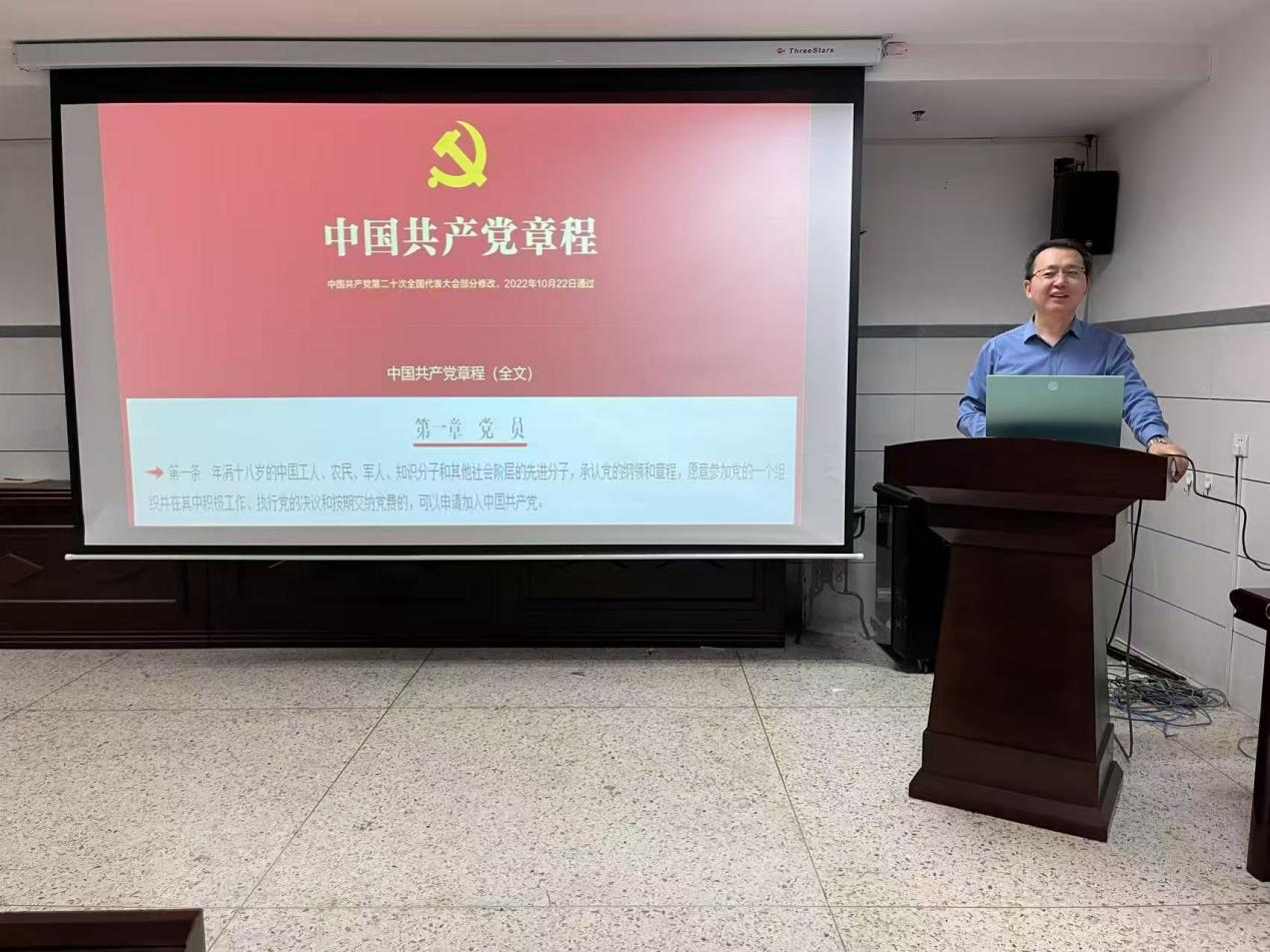 孙玉伟老师讲授了中国共产党章程的作用,列举了中共一大到中共二十大党章历次制定及修正概览,强调了党章是党的最高行为规范、党章是党员意志的集中体现、党章是教育党员增强党的意识的教科书、党章是党从严治党的根本依据。