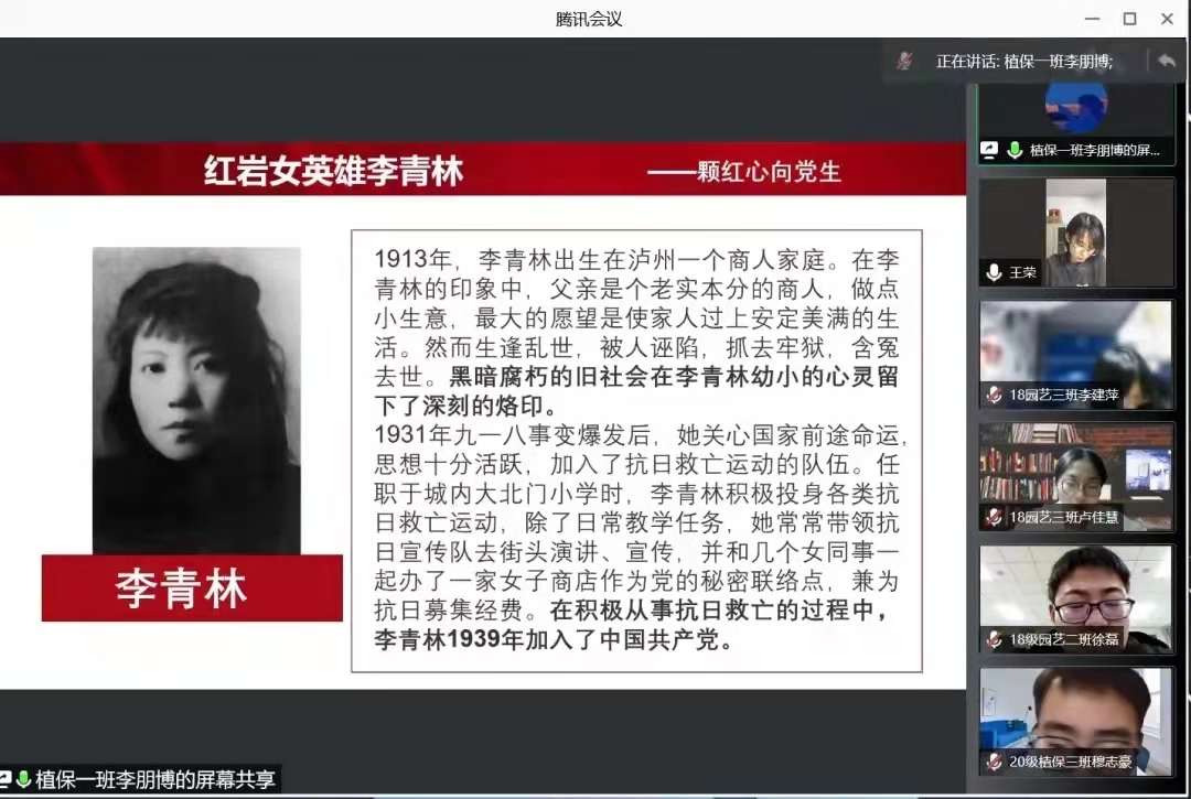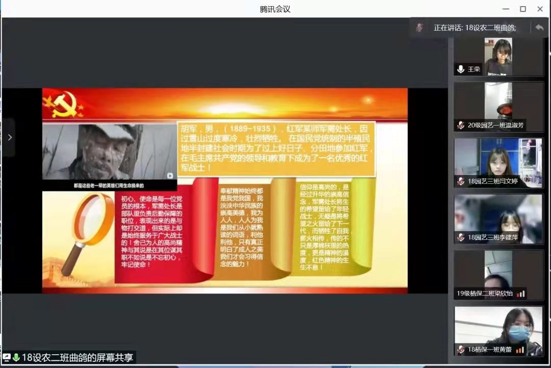 讲好红色故事,不仅是为了铭记历史,更是为了开创未来。同学们用赤诚真挚的情感生动地讲述了党在各个时期的红色故事,18级设农二班曲鸽为大家讲述了军需处长胡军无私奉献、舍己为人的感人故事;20级植保一班丹阳向大家分享了烈士黄魂为保护村民战友壮烈牺牲的英雄事迹。这些故事真实反映了100年来中国共产党人所具有的艰苦奋斗,牺牲奉献,开拓进取的伟大品格。赛后由王荣老师做总结发言,她强调此次活动旨在让同学们从中感悟红色真谛,汲取信念与力量,不仅做到在思想上入党,更要在行动上入党。