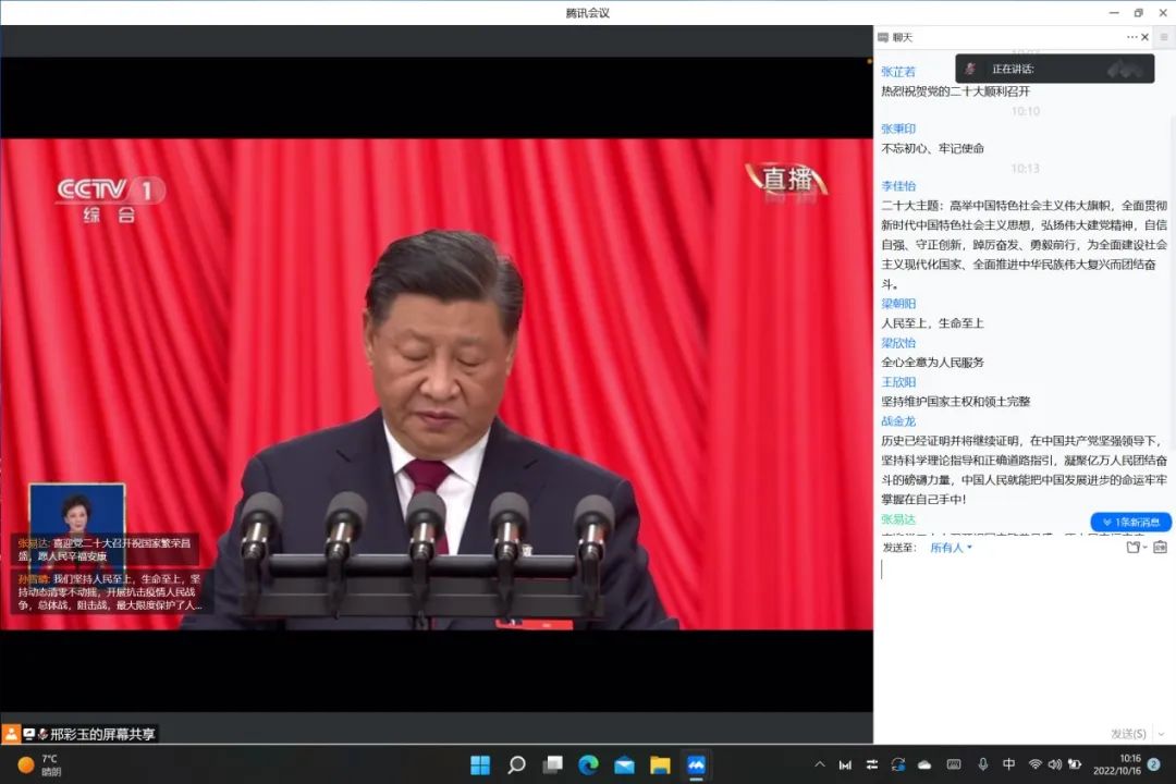 大会的主题是:高举中国特色社会主义伟大旗帜,全面贯彻新时代中国特色社会主义思想,弘扬伟大建党精神,自信自强、守正创新,踔厉奋发、勇毅前行,为全面建设社会主义现代化国家、全面推进中华民族伟大复兴而团结奋斗。大家认真聆听习近平总书记所作的报告,“全党同志务必不忘初心、牢记使命,务必谦虚谨慎、艰苦奋斗,务必敢于斗争、善于斗争,坚定历史自信,增强历史主动,谱写新时代中国特色社会主义更加绚丽的华章。”“新时代的伟大成就是党和人民一道拼出来、干出来、奋斗出来的!”党员同志们在听到总书记的精彩讲话后,纷纷在留言板上打出了习总书记的金句以及自己在观看过程中的所感所想。