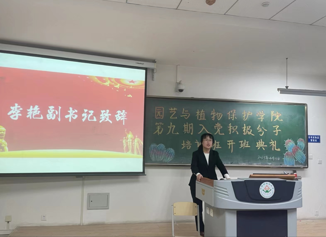 典礼第二项,李艳副书记致辞。她围绕开展培训班的总体要求、培训目的两个方面点明了开展培训班的意义,对学员们提出以下三点要求:一要在思想上端正入党动机,加深加强对党的基本理论学习,真正在思想上入党;二要在行动中严格自律,在平时的学习、工作、生活中起到模范作用,处处约束自己的行为,严格遵守校律校规;三要在组织上服从管理安排,积极参加各项组织活动,尊重党课授课老师,时刻做好充分的准备。