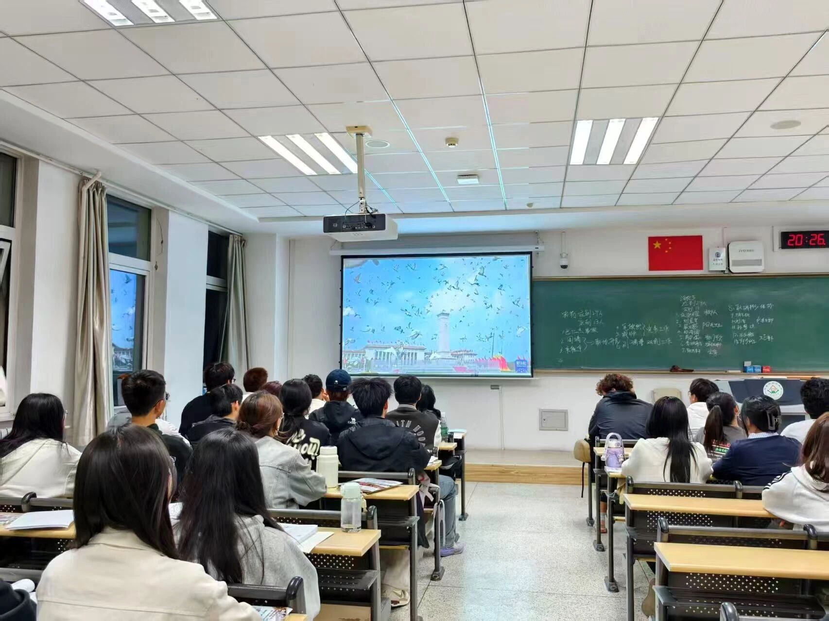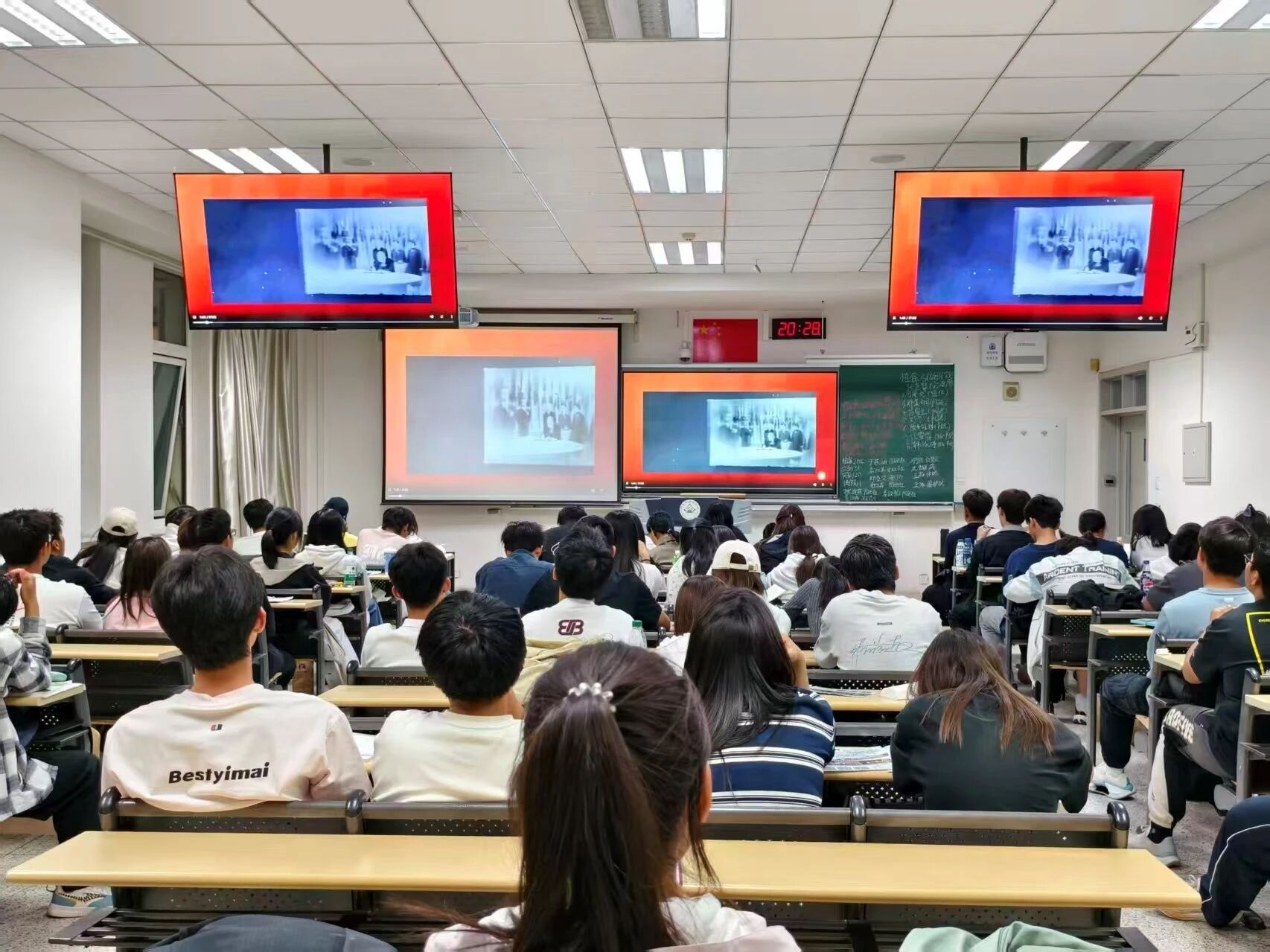 于南教518、524教室组织2025级学生观看《弘扬伟大抗战精神,做光荣自豪中国人——纪念中国人民抗日战争暨世界反法西斯战争胜利八十周年》主题教育片。