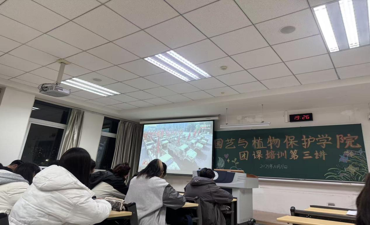 10月19日晚,团课第三讲是集体观看抗战胜利80周年阅兵视频回放,当威武的方队迈着铿锵有力的步伐通过天安门广场,当先进的武器装备列阵前行,当空中梯队呼啸而过留下绚丽彩烟时,同学们不禁发出阵阵赞叹,真切体会着“今日和平是先烈用鲜血换来”的内涵。此次团课,不仅让同学们直观感受到祖国的大国风范、军人风采与科技实力,更让“强国有我”的信念深植心中。