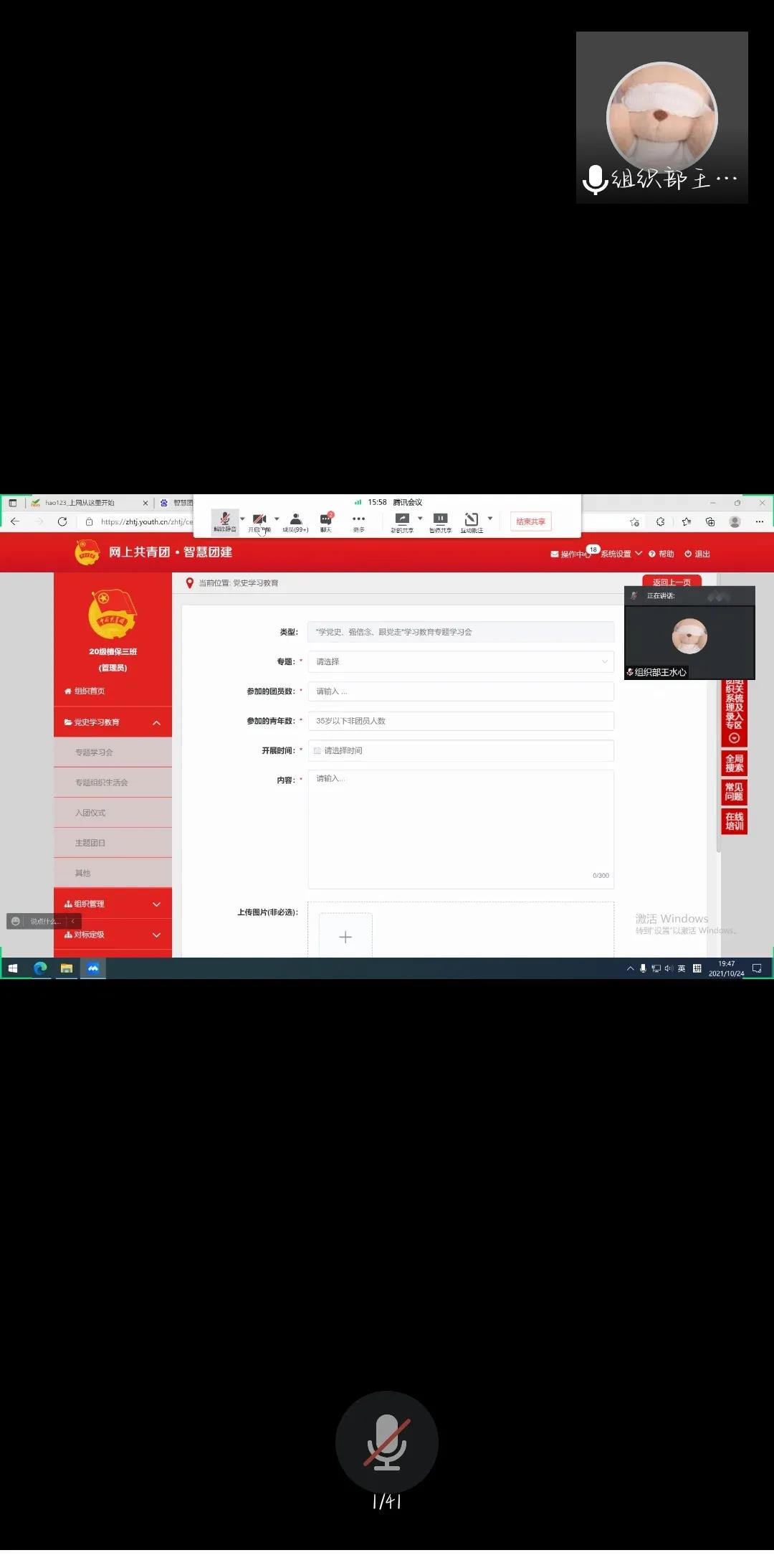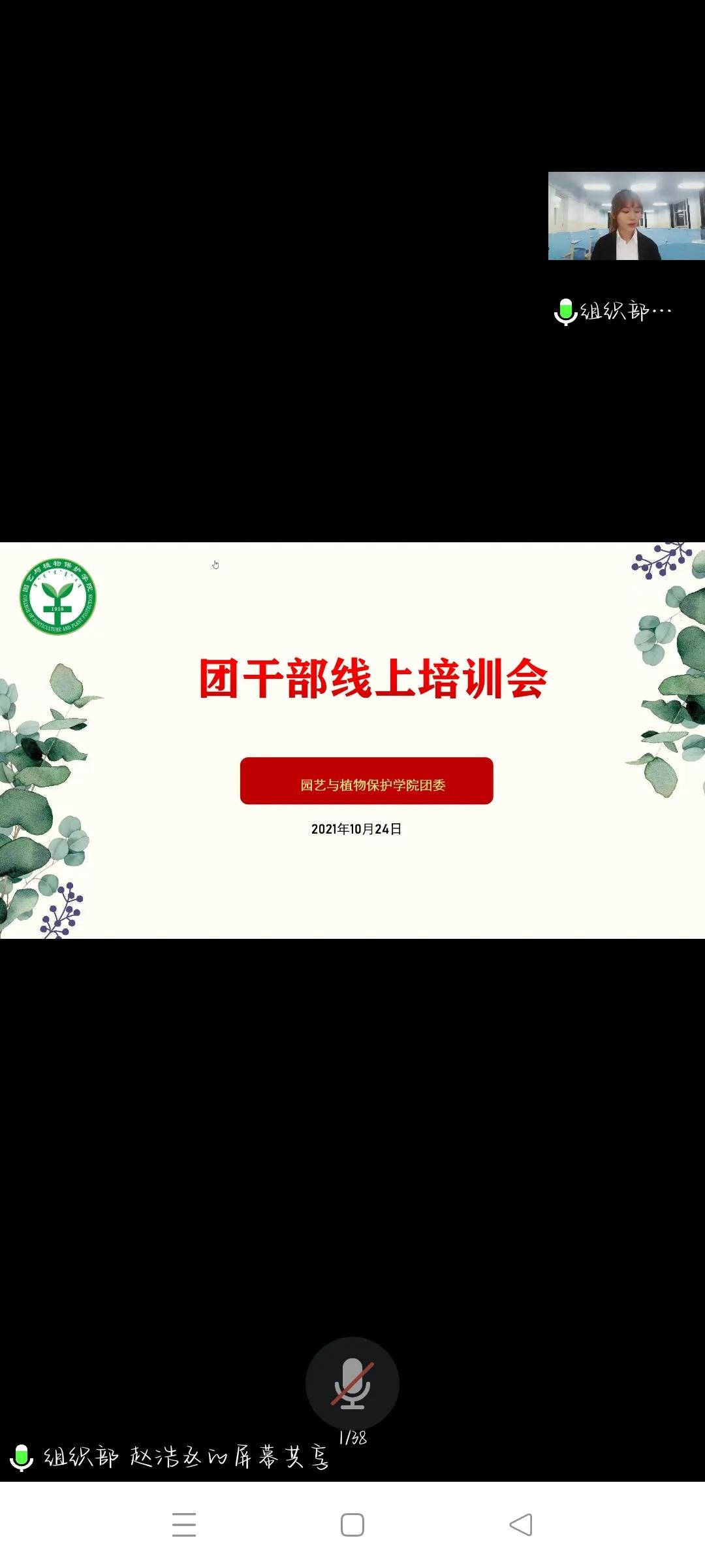 分团委组织部、宣传部、社服部、电影天堂共同举办的团干部培训会通过腾讯会议举行,团委老师郝凤英出席本次会议,会议由组织部的王水心主持。
