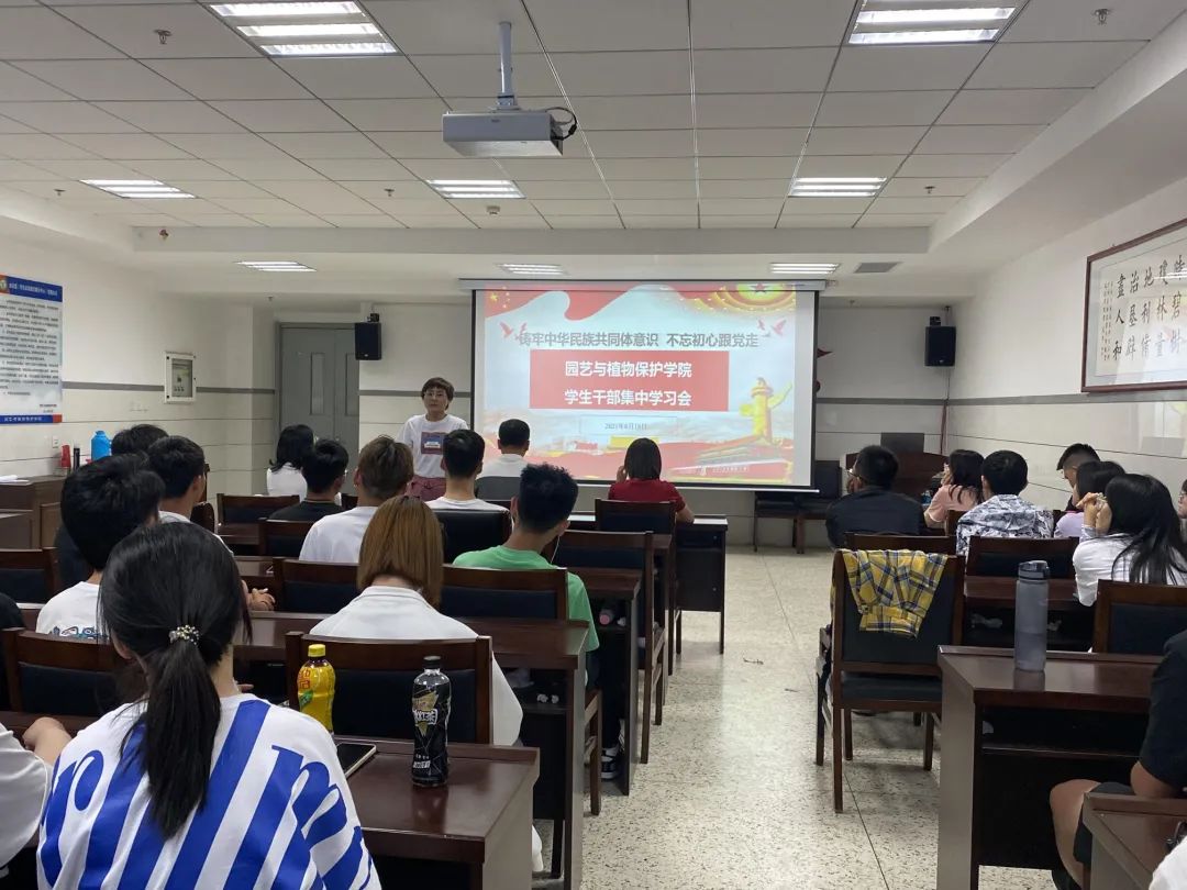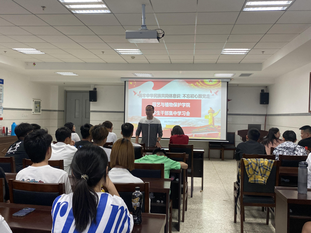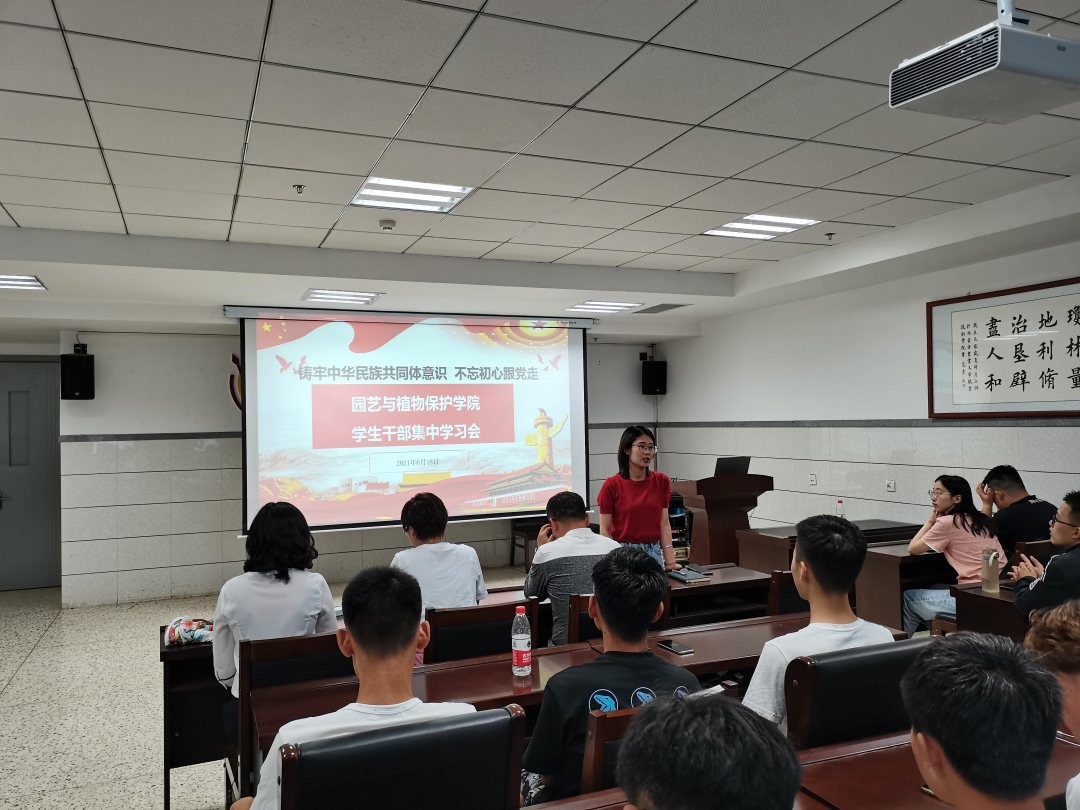 在生科楼419召开了“铸牢中华民族共同体意识,不忘初心跟党走”主题学生干部学习会。学办老师尚飞、学办老师尤丽、学院专职辅导员王荣出席,园保院全体学生干部参加,团委老师郝凤英主持会议。