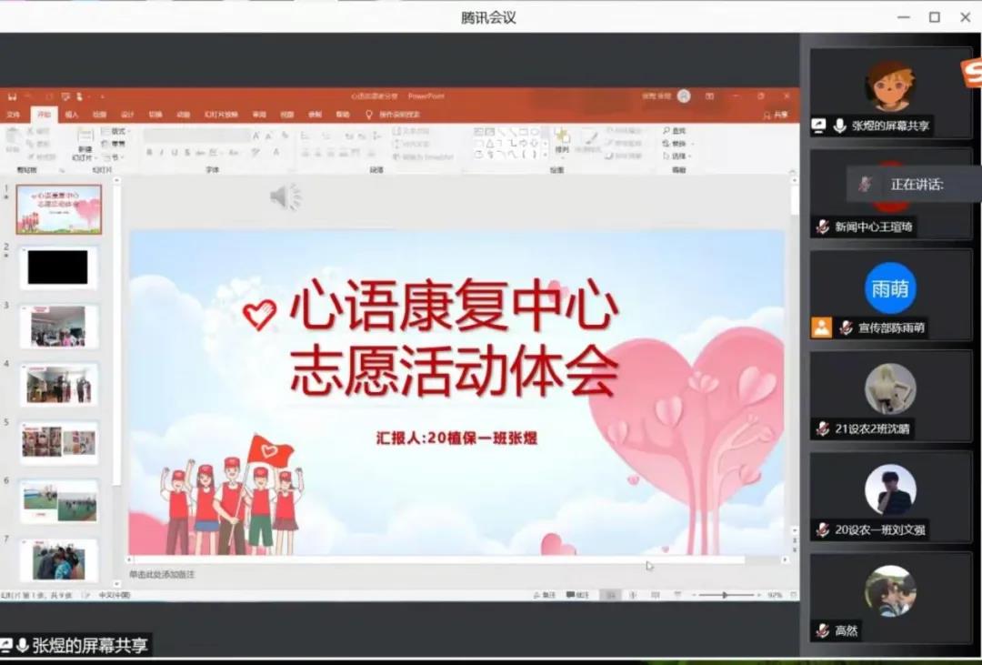张煜同学分享他作为心语康复中心志愿者的一员,讲述了自己在帮助那些身患残疾的小朋友过程中,看着小朋友虽然残疾但依旧对生活充满希望与爱意,感触颇深,他希望这个世界没有冷眼与嘲讽,他愿意用自己的力量去帮助每一个需要帮助的人。