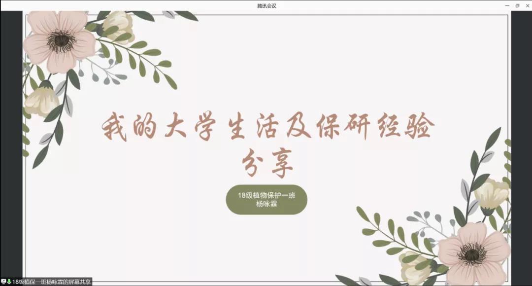 于腾讯会议线上举行“绚丽青春,植手同行”第四季第一期青年成长论坛,本期的主题是“学霸来了”。18级植物保护一班杨咏霖同学、18级园艺二班何文炳同学、18级设施农业科学与工程一班马淑慧同学作为本期的特邀主讲嘉宾,线上共计230余人参加。