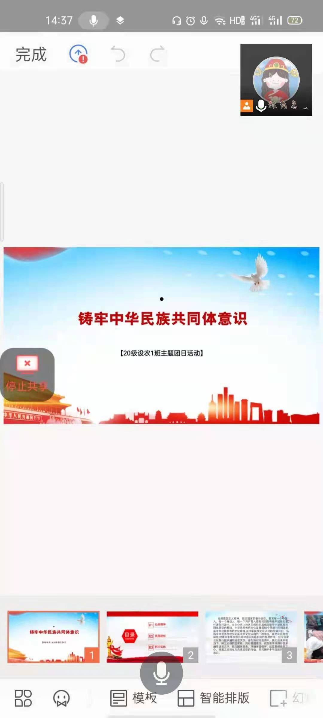 20级设农一班以“铸牢中华民族共同体意识”为主题的团日活动于线上开展,本次会议由团支书田美琪主持,设农一班全体同学参加。