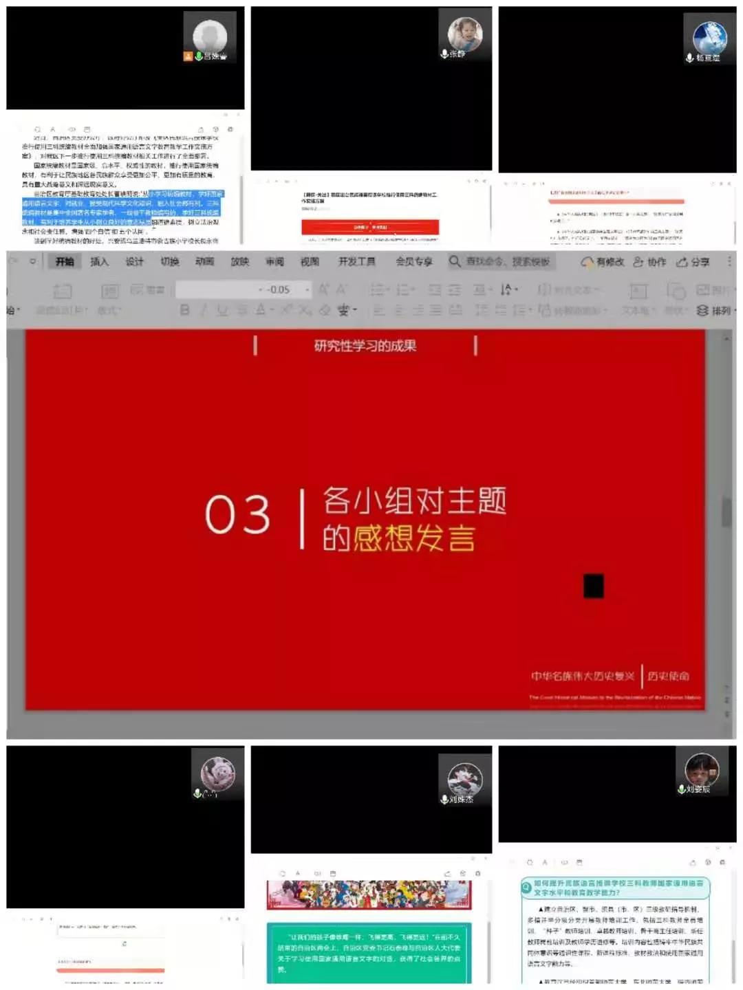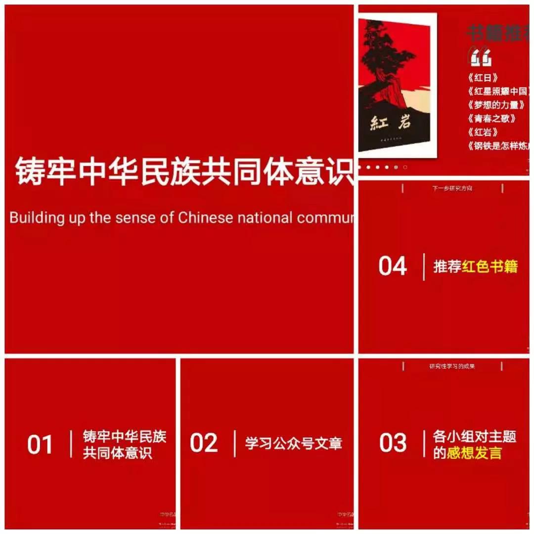 活动中,吕姝睿同学带领大家学习了有关铸牢中华民族共同体意识的相关文件。重点学习了:推行使用三科统编教材和全面加强国家通用语言文字教育教学工作的政策和推行其的重大战略意义。随后,同学们交流了自己在学习后的感想,大家纷纷认为:中华民族大团结,根本是增强文化认同,建设各民族共有精神家园,积极培养中华民族共同体意识势在必行。另外,同学们还针对假期阅读的红色书籍进行了分享,《红岩》《红星照耀中国》等经典图书引起了广泛的热议,唤起了大家的共鸣。最后同学们一起欣赏了优美的歌曲《灯火里的中国》。