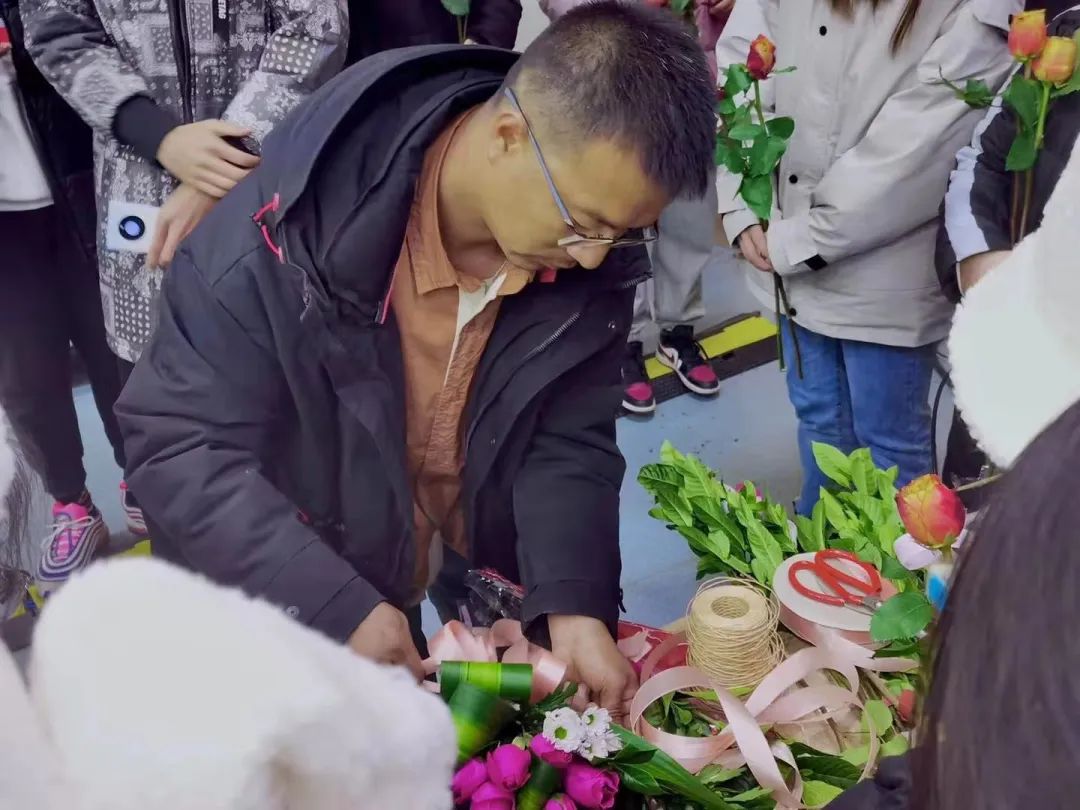 段飞师兄首先带领同学们认识了各种花材,为学生们拓展了花卉知识,并指导学生进行手捧花制作。在制作过程中,同学们将所有带分叉的花材花头10厘米以下的的分叉、叶子剪掉,用螺旋的手法依次添加花材,一支主花加一支配花或叶子,然后用丝带把花杆缠绕一圈,用力拉紧,使整个面服帖光滑,最后缠绕完成后收尾打结,以漂亮的法式蝴蝶结点缀,一束美丽的捧花就制作完成了。在大家动手制作的过程中,同学们还认识到手捧花一定要选择适合的花材并将其颜色进行合理的搭配。看着自己精心创作的作品,同学们更是爱不释手,纷纷拿起手机拍照。