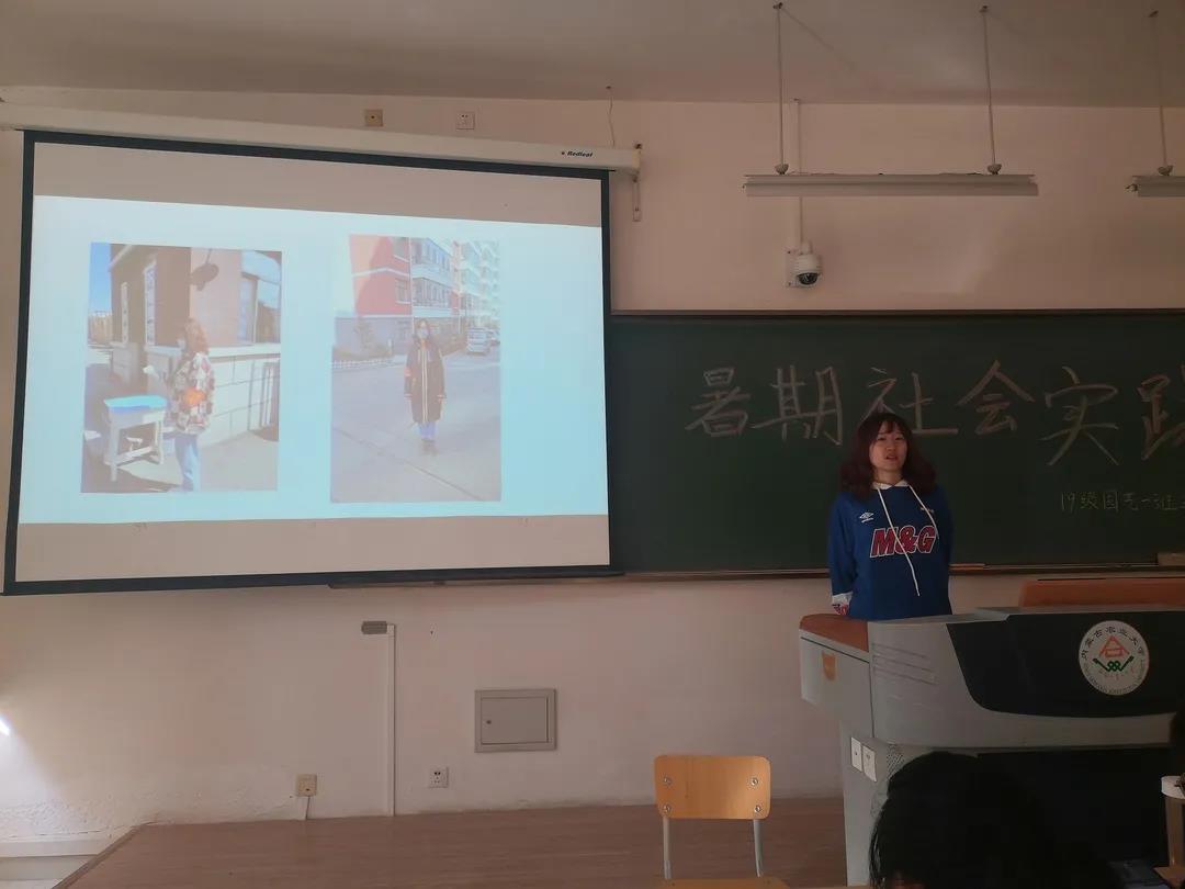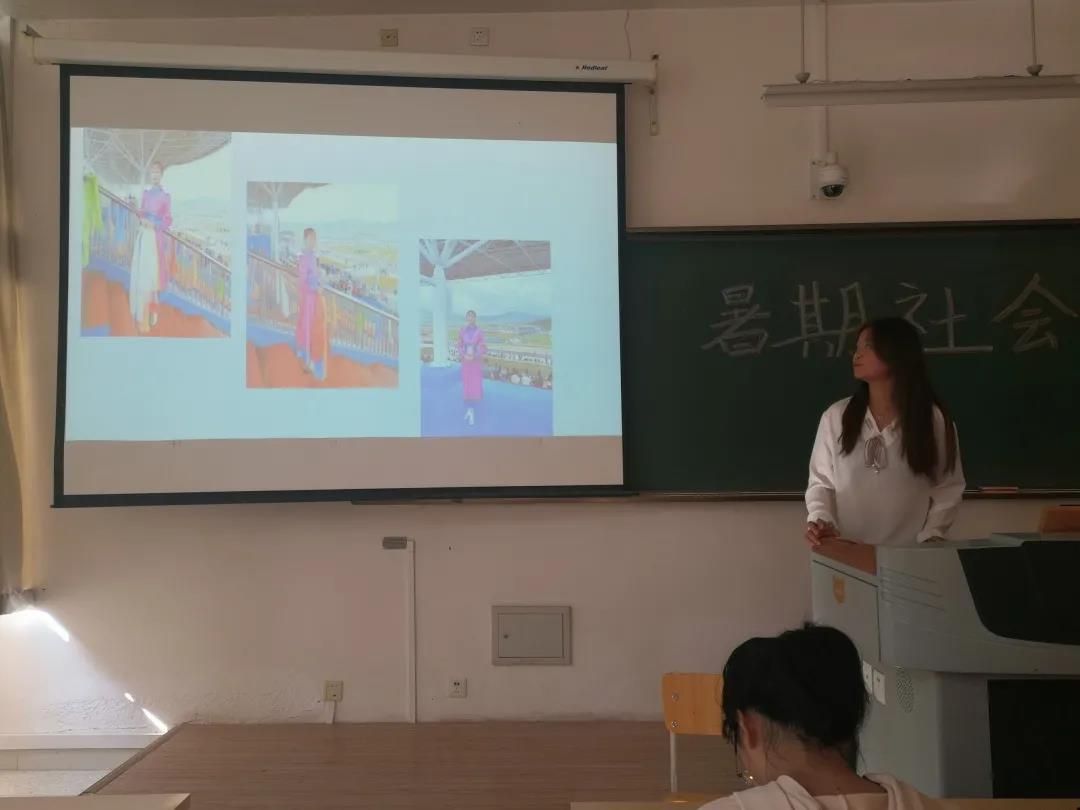 活动开始,于世杰分别请了三位在假期实践活动中表现突出的同学来分享经验,交流感悟。其中汤在朝同学讲述了自己在家乡为退休老人测量体温,送温暖,与大院生活的人们相处的点滴,展现了当代大学生昂扬的志愿精神面貌,在服务奉献中表露爱国情怀,在实践锻炼中增长知识才干。代阿茹娜同学身着蒙古长袍在那达慕大会上系哈达,摆纪念品,引导观众入席,向大家展示了自己民族的节日风俗和文化的魅力。肖静怡同学也分享了自己在社区工作人员的带领下,出入排查,引导外出返乡人员及时主动到社区登记备案的故事,向同学们传递了当代青年大学生的价值判断力与社会责任感。