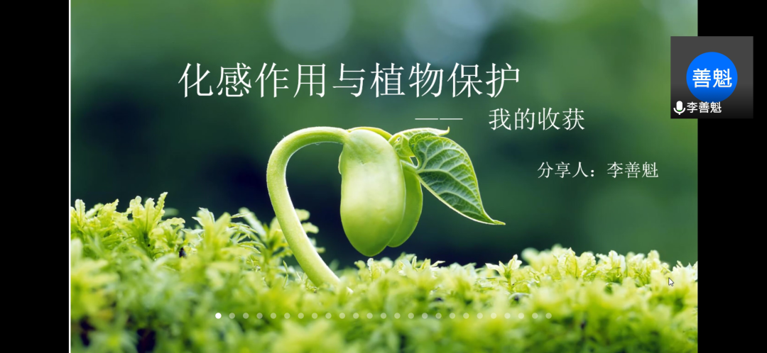 活动中,主讲人李善魁以“现象到本质--化感作用与植物保护”为主题,通过化感作用的简介,植物、微生物昆虫互作,圆柏化感除草,科研经历与创新创业四个方面进行讲述。随后分享了从植物与昆虫、植物与植物之间的化感作用得到的思考,并在导师张笑宇老师的指导下深入实验室,逐步走向“化感”研究的道路,最终将理论转化于实践,在创新创业的赛事中取得各项成绩。李善魁讲到:自己的荣誉离不开导师与团队,希望各位学子在实验过程中要学会善于思考,与导师善于沟通,虚心学习。互动过程中,郝凤英老师、张笑宇老师、李艳艳老师先后发言,对李善魁的努力与拼搏给予肯定,并望其能够继续努力,为新一代青年人做出榜样,同时号召电影天堂
