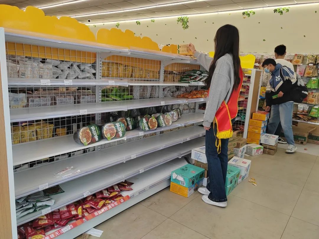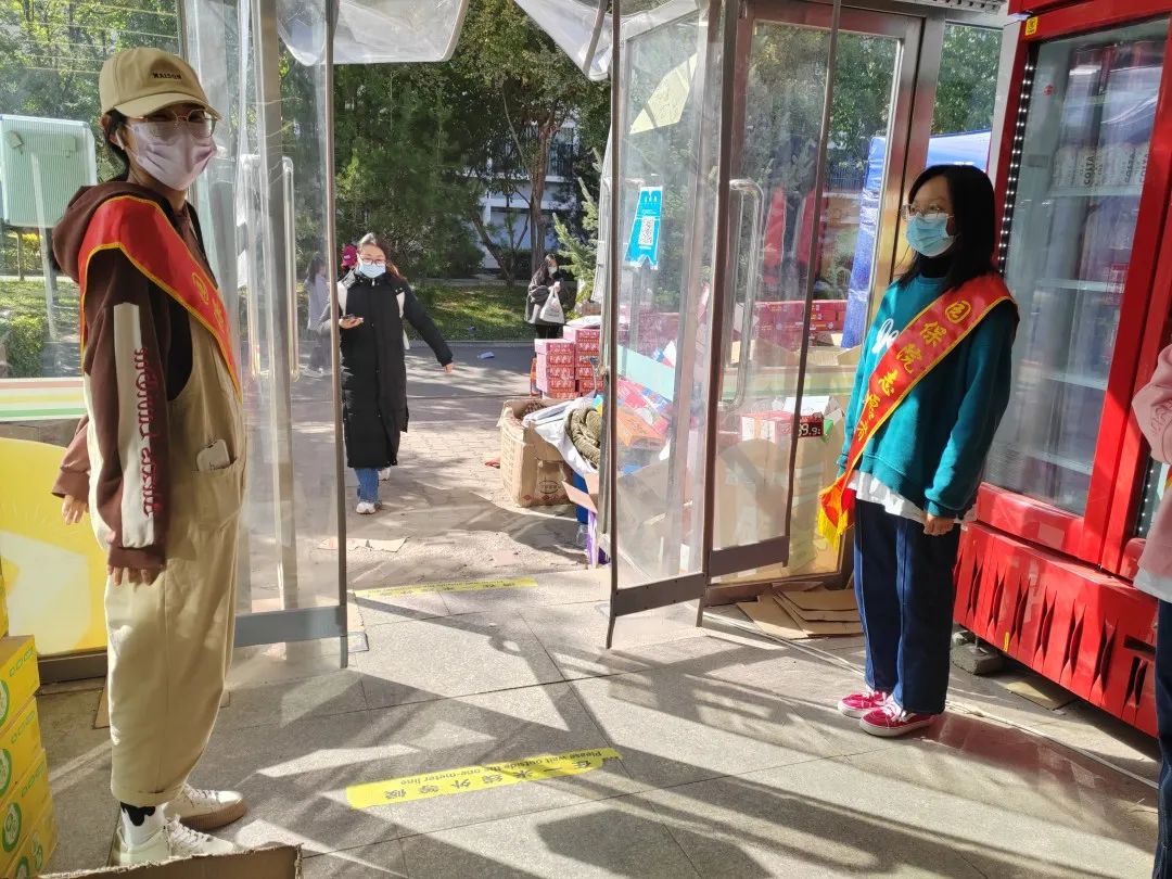 在校园利客超市人流量较大的时候,志愿者们也积极提醒同学们有序排队,扫码进入超市。此外,志愿者们也帮助超市工作人员理货,保证超市可以有序运行,满足同学们的基本生活需要。