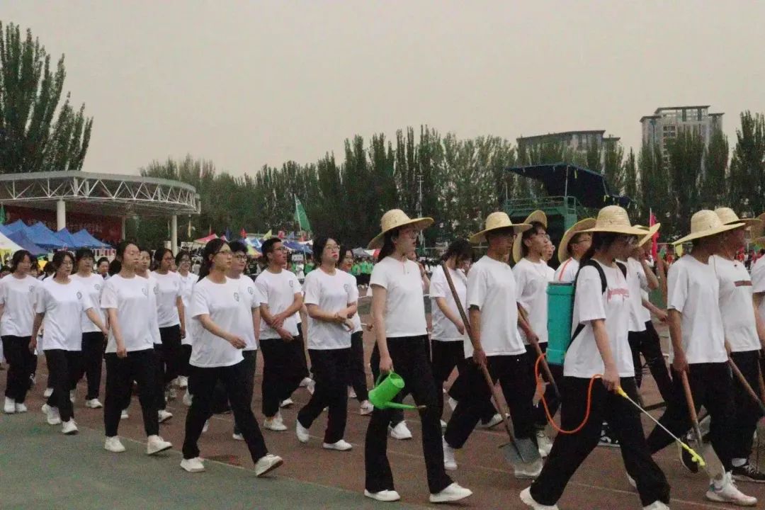 方阵队伍身着统一服装,步伐稳健,姿态昂扬,同学们头戴草帽,手拿农具,创意十足,充分彰显了专业特色。
