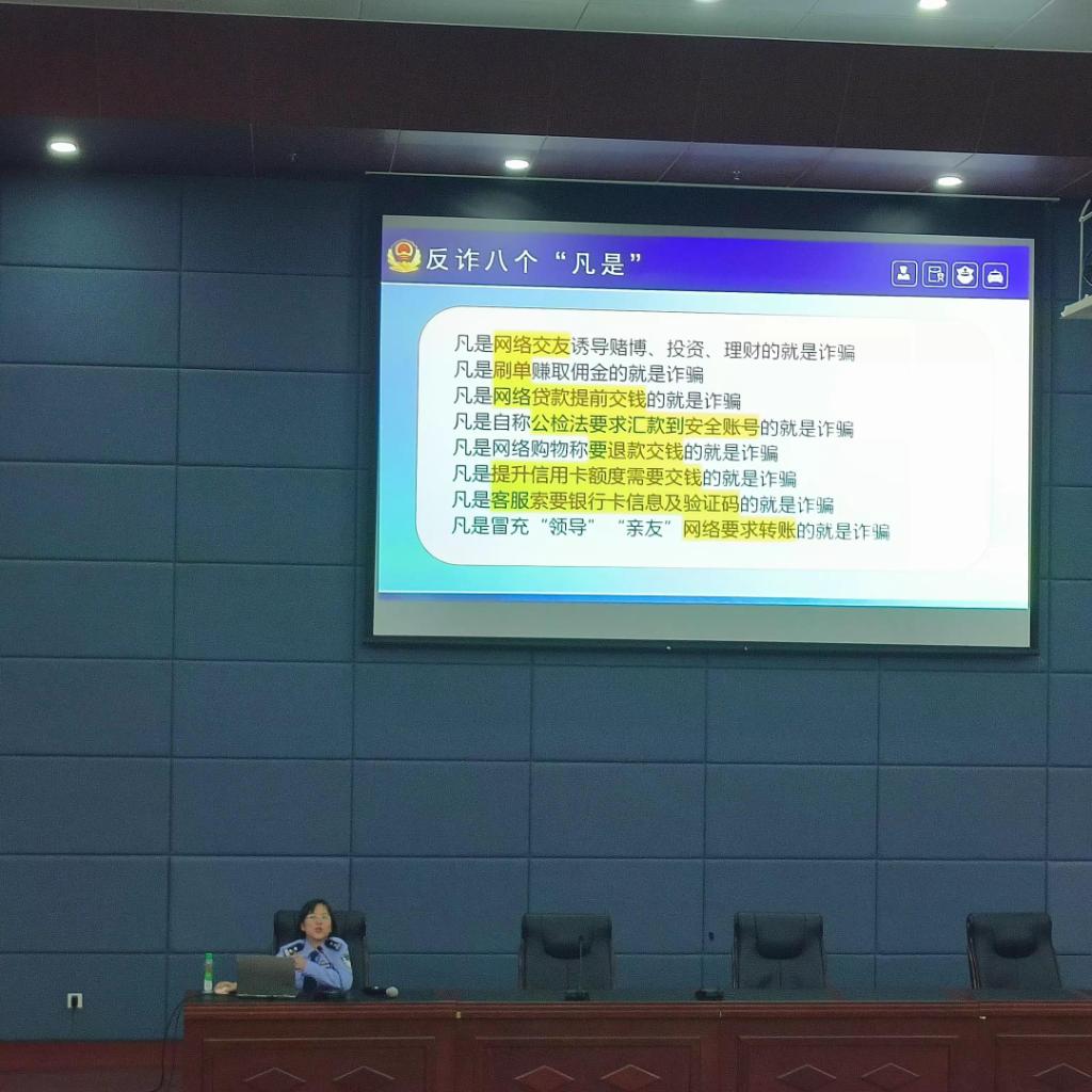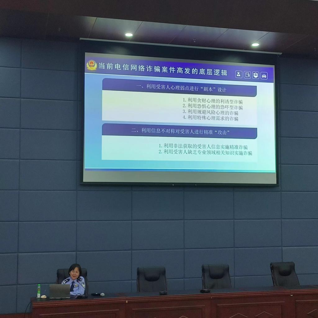 于新区生科楼二楼报告厅开展新生入学教育第五讲,即反电信诈骗安全教育大会。本次大会邀请了新城区公安分局情指中心教导员贾耀霞、民警毛慧春和孙正,其中贾耀霞做了题为《警校携手同行,共建无诈校园》的报告。会议由电影天堂