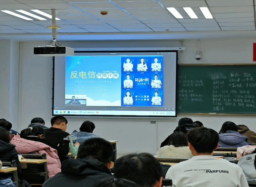 组织大一学生在南教426与524教室观看反诈教育视频。此次视频内容是学校录制的由赛罕公安分局反诈中队中队长——高飞警官主讲的《加强平安校园建设,提高师生反诈意识》。