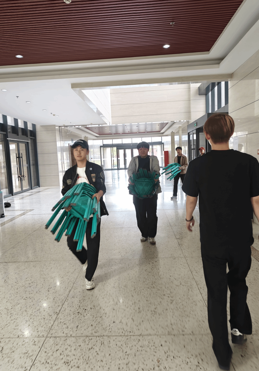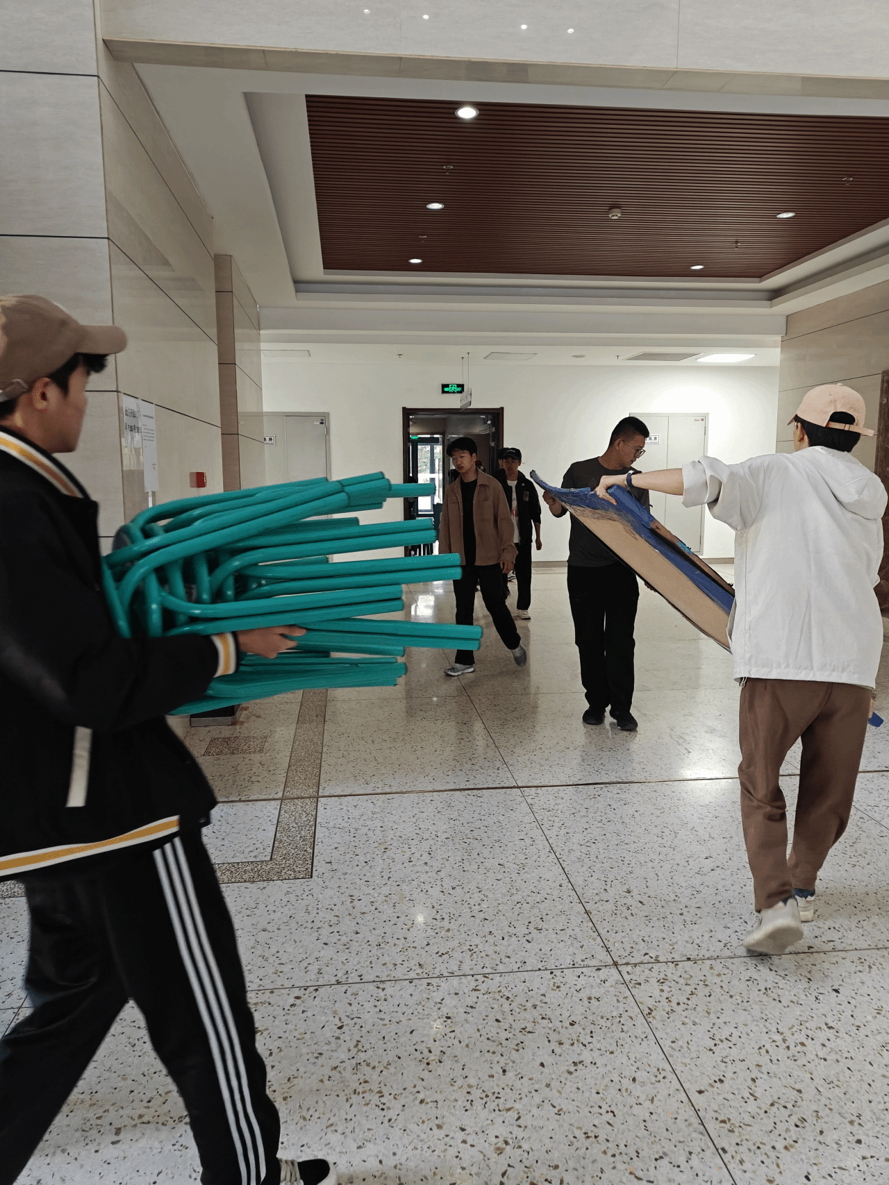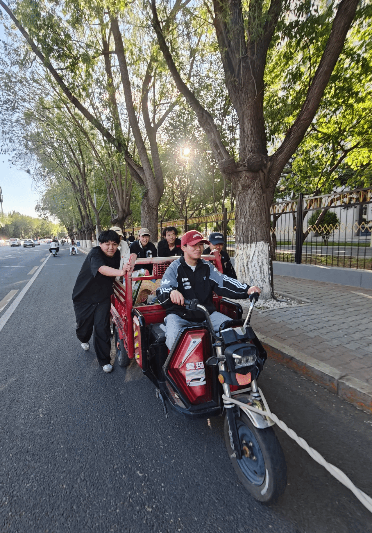 物资运送组的同学们在运动会结束后进行分工协作,拆卸帐篷、清点物品、搬运物资,大家互相配合,彼此帮助。当在学院三轮车故障无法正常行驶的情况下,同学们齐心协力,有的在前面拉,有的在后面推。尽管大家气喘吁吁,手掌磨红,却始终保持着昂扬的斗志。