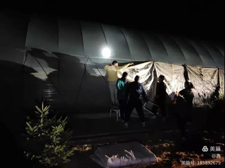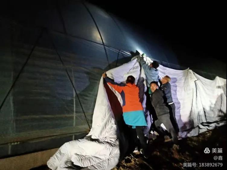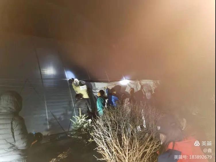 同学到达现场后没有耽误每一分每一秒,迅速进行分工,很快就找到了窍门,开始有序地相互配合工作。同学们有剪绳子的,有剪卡簧的,有拿灯照亮的,有往棚膜上放棉被的,个子大的同学用卡簧和绳子固定棉被,其他同学在旁边帮着向上拖着棉被,然后用一块棉被压着一块棉被往下进行安装。