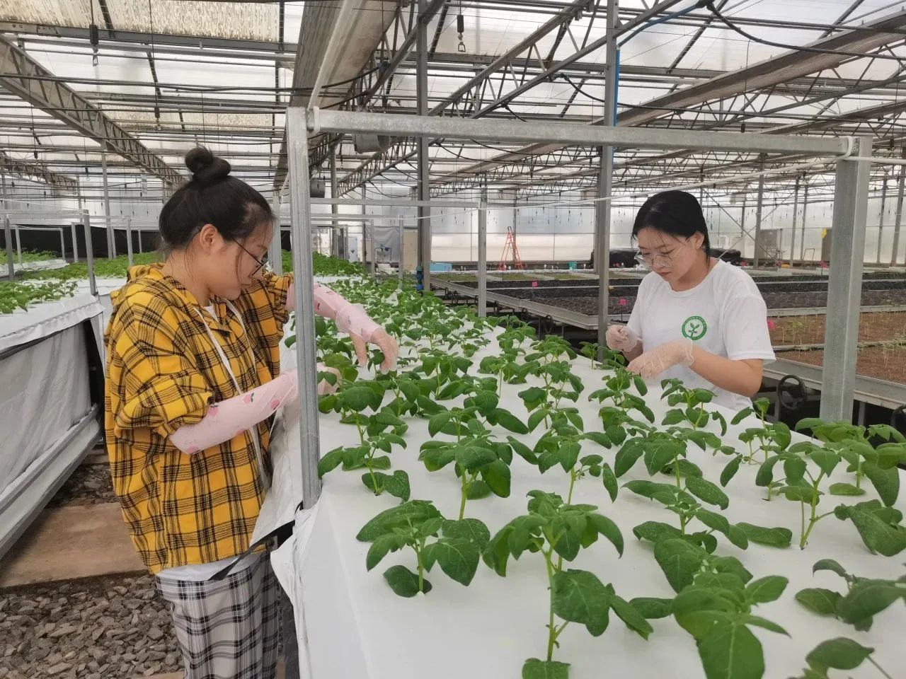 下午,同学们来到温室参观了马铃薯苗子的不同种植方式和马铃薯种植对比实验,并在工作人员的带领下对无土栽培的营养液进行配置。随后,同学们分组,有的对雾培马铃薯苗子进行了修剪,有的对盆栽马铃薯苗子进行除草作业。
