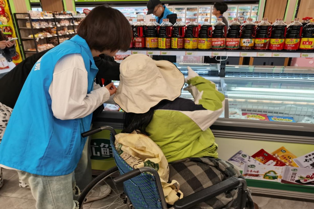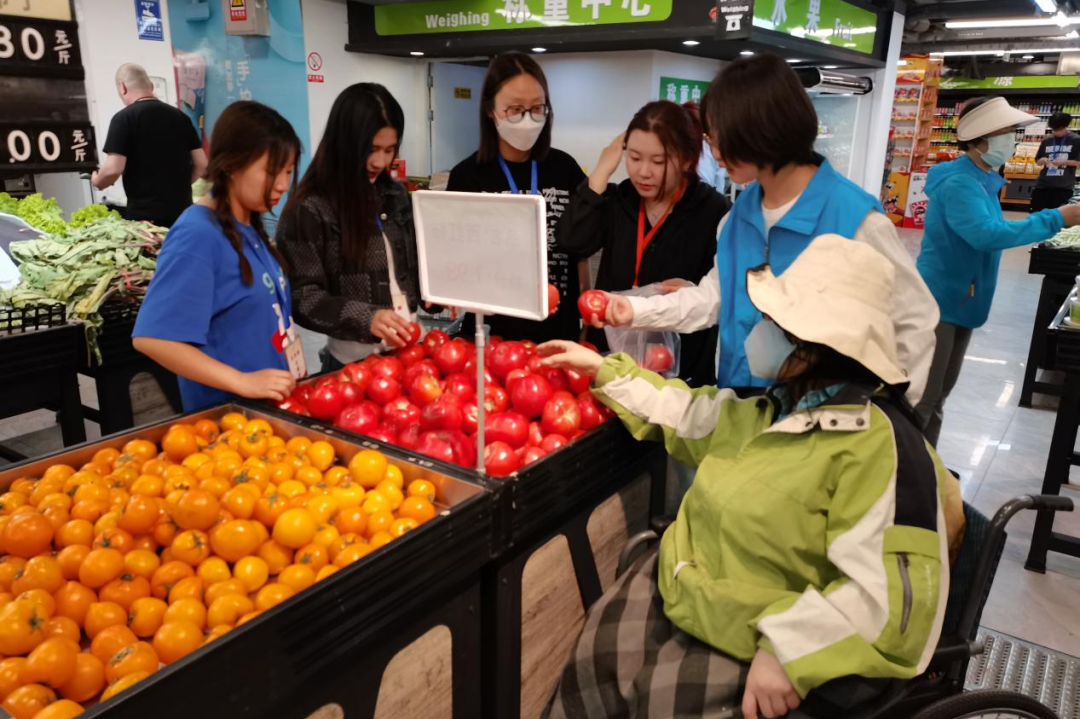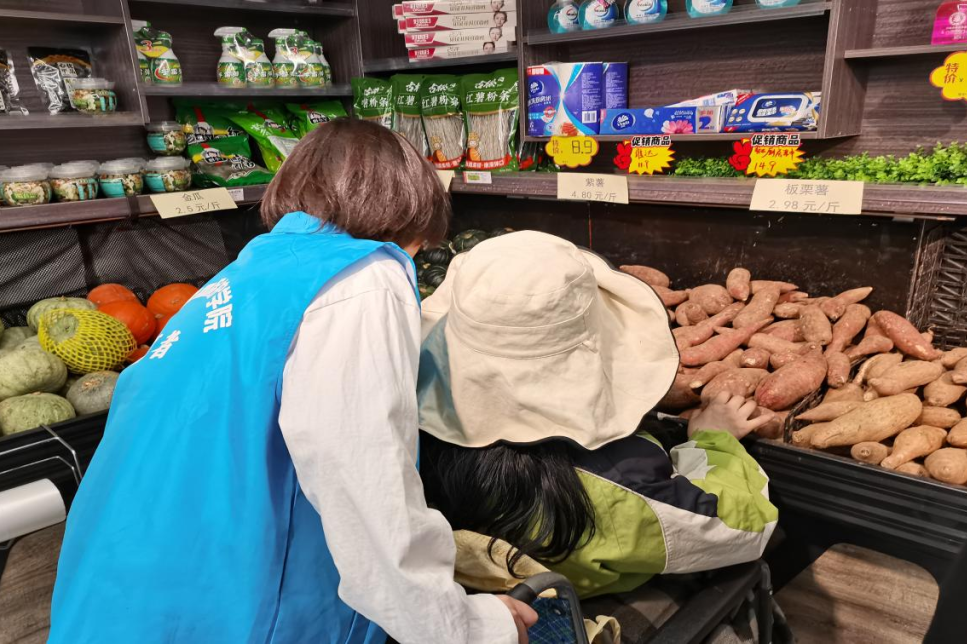 志愿者陪同叶大姐一同前往“尚九超市”进行了商品的选购。在选购蔬果食品时,叶大姐耐心地为志愿者讲述如何选购新鲜美味的产品,志愿者们也都认真记下这些生活的知识。志愿者在同叶大姐聊天中,惊奇地发现叶大姐不仅能清楚地记得每一位志愿者的名字,她还能熟练运用网络流行语与志愿者们交谈,诙谐幽默使人倍感亲切。