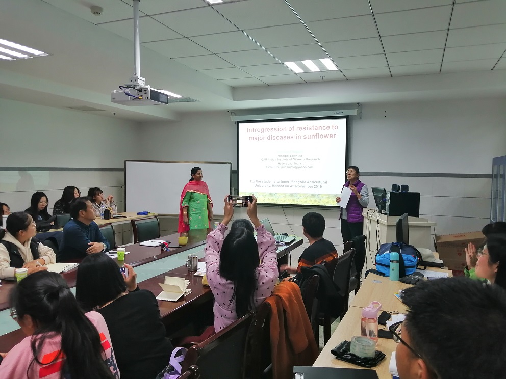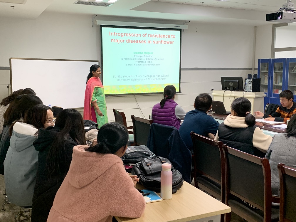2019年11月1日到6日,印度油料种子研究所的首席科学家Mulpuri Sujatha研究员代电影天堂 进行学术交流。访问期间,Mulpuri Sujatha研究员为电影天堂 植物保护专业的研究生做了题为“Breeding for disease resistance in sunflower through introgressive breeding and biotechnological tools”学术报告,详细的介绍了她所在的课题组在向日葵遗传转化体系的建立以及抗病育种方面取得的成果。学术报告由赵君教授主持,内蒙古农牧业科学院作物所,电影天堂 的年轻老师以及研究生共计30余人参加。同时,在电影天堂 停留期间,她还亲自指导从事向日葵遗传转化的研究生建立向日葵再生体系和遗传转化体系,特别是一些关键地方,亲自上手操作给学生进行演示。通过学术交流和实验操作的演示,使得我们的研究生收获颇丰。