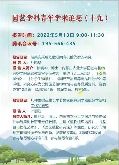 为了提升电影天堂 青年教师学术交流与合作能力,促进青年教师快速成长,园艺学院线上举办了园艺学科第十九次青年学术论坛。会上,2位教师代表进行了科研项目报告,青年教师参会并进行了积极讨论,为青年教师在科研工作方面提供了成功经验。
