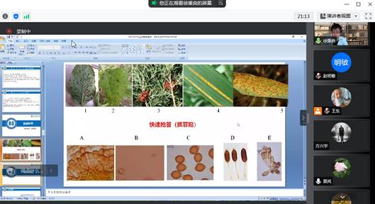 为了提升自治区级一流课程普通植物病理学的教学水平、推进“植物保护”国家级一流本科专业建设,植物病理教研室开展校外教师进课堂活动。分别于5月17日和24日邀请甘肃农业大学徐秉良教授、西北农林科技大学詹刚明副教授,为2020级植物保护专业本科生进行了普通植物病理学的线上授课。两位专家精彩的讲课以及与学生的互作讨论,不仅激发了学生学习理论专业知识的兴趣,还了解到专业知识的应用前景。课后,他们还给教研室老师们分享了丰富的教学经验。